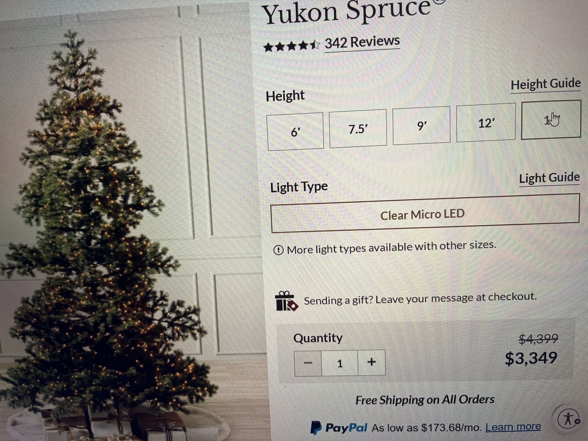 13-14’ artificial tree. Prelit. Large big beautiful branches with artisan tips. Currently still up if you’d like to see it or more photos. Just our last year hauling it to third floor attic. It has a nice sturdy stand and tree breaks down into 4 sections. It’s really beautiful but a pain to hang ornaments that high for us so I have pics of last year with ornaments and this year without them.