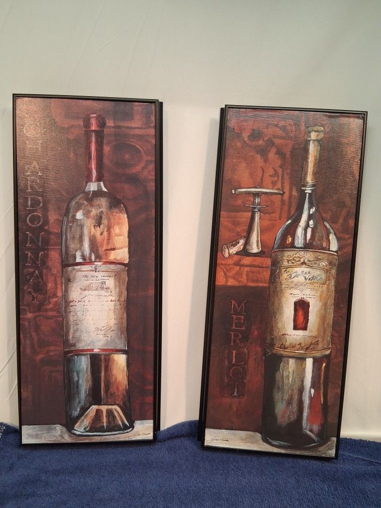 2 Vintage Tuscan White and Red Wine Bottle Set; Two Brown framed 20-1/2" x 8-1/2" x 1-1/2in Prints; Ready to hang. Minor Damaged Upper Right Corner On One Frame And Top Hardly Noticeable, Please See Photo.