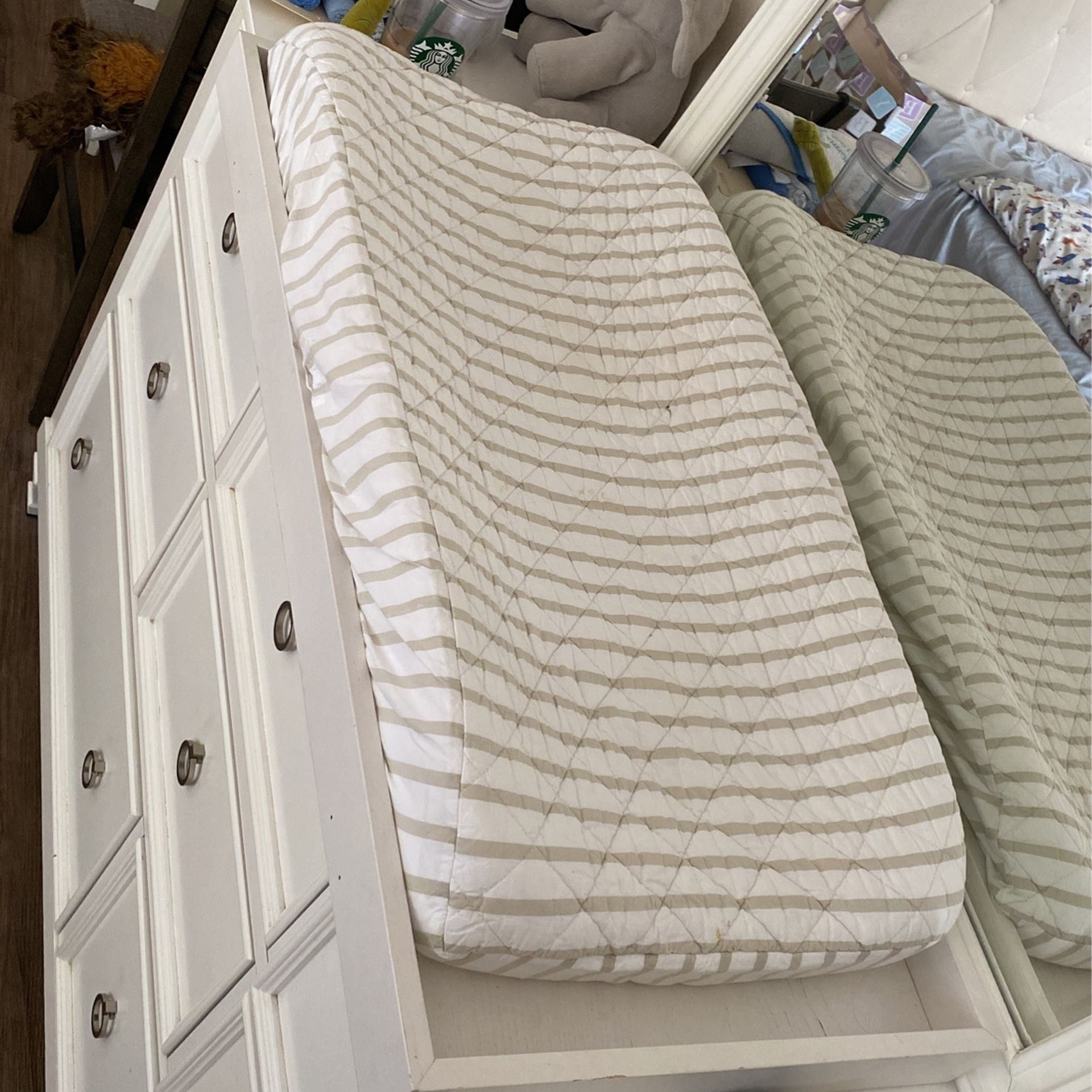 Baby changing table base and the cushion. Has straps to clip and strap the baby in for safety, and I’ll include the changing pads I have, which are washable. This only includes the foam, different changing covers and the wood base, not the dresser