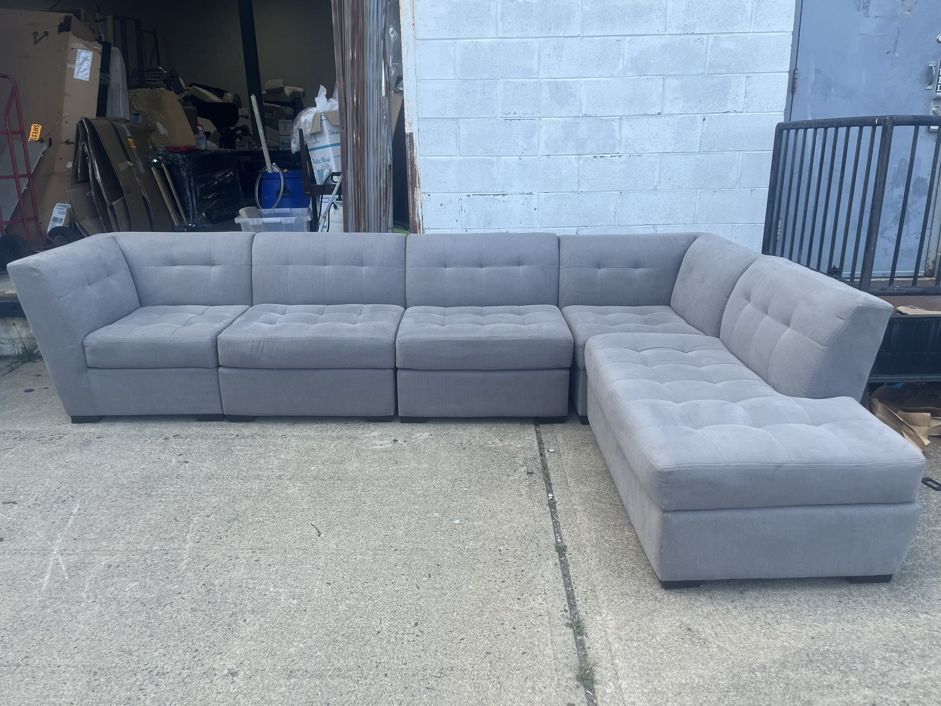 Macys Brand Sectional $750. Gray fabric sectional. Five piece sectional with attached tufted fabric cushion, wooden feet with grips and chaise. Can be arranged differently and all pieces can be used individually as they are finished on all sides. I have more items available. Check out my listings. Viewing by appointment only. Delivery available for a fee