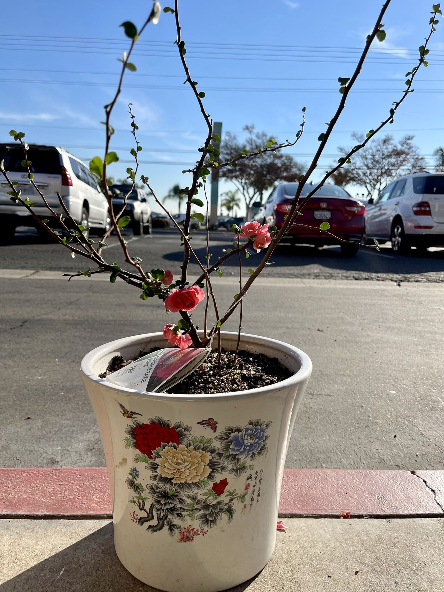 Quince double take 3 colors, red, peach, and pink. Comes in 5 Gao ceramic pot $180. Cây hoa anh đào Nhật có trong chậu sành có ba màu hồng, cam, và đỏ. $180