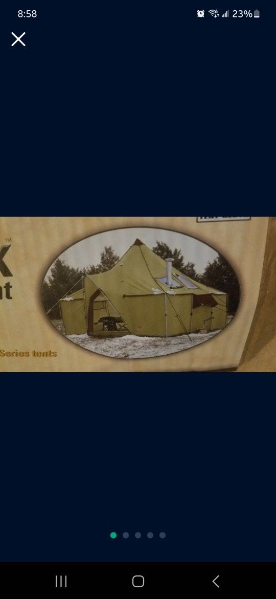 Stay nice and toasty on those cold nights hunting, fishing or camping and cook inside the tent using a military stove (not included) with this brand new never opened 12 x12 Cabelas Alaknak tent. Listed for 899.00 at Cabelas YKK Zippers function in all temps. Drop Flap US. Military Stove Jack, Reinforced Brass Grommets. Its like a portable heated cabin. Big enough for 2 cots and a table and a wood burning stove.