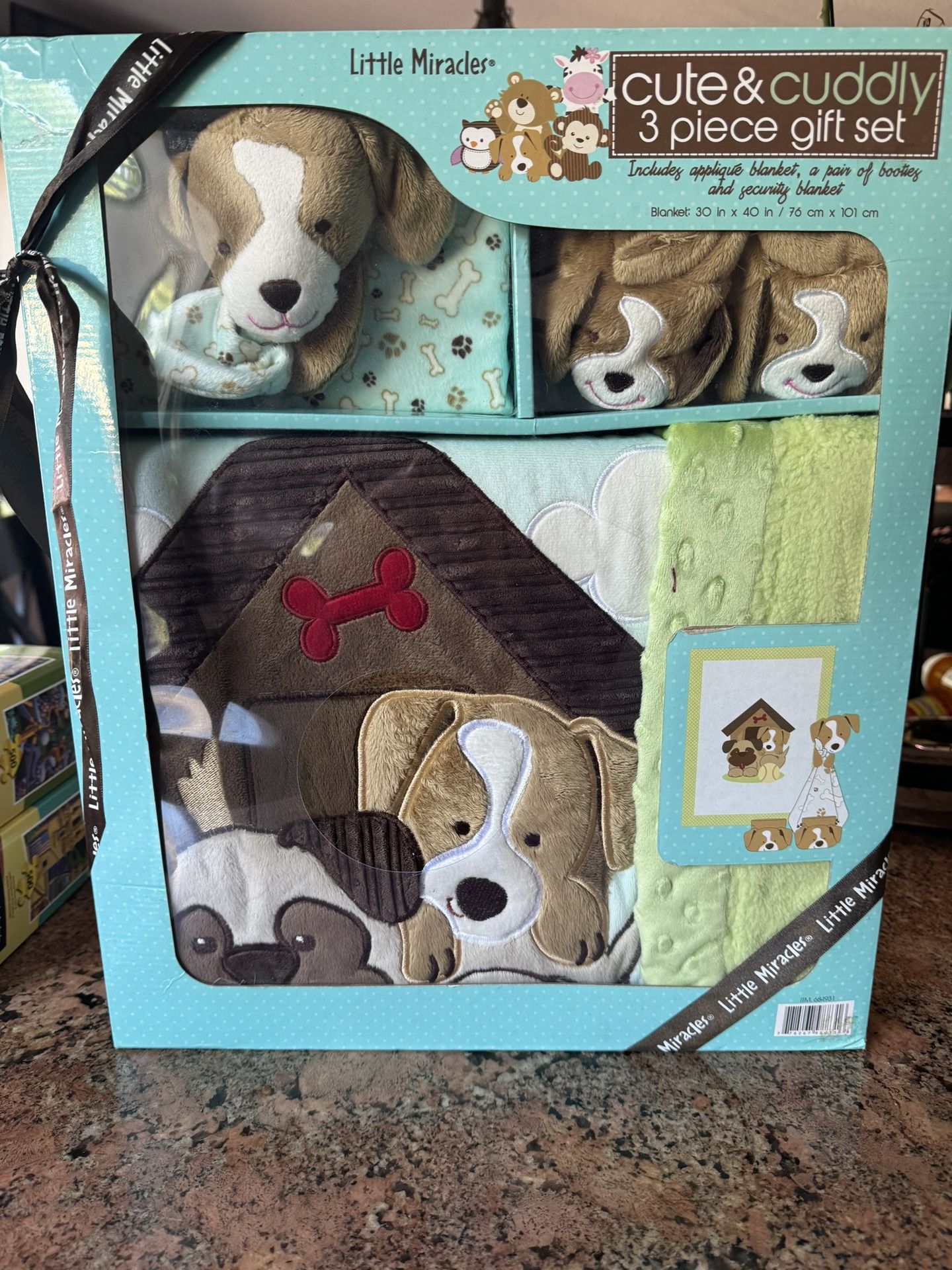 Includes applique blanket, pair of booties, security blanket. New unopened