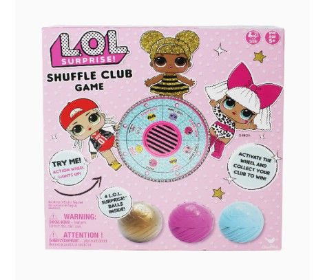 Description Any L. O. L. Surprise fan will love this Shuffle club board game! In this ttly awesome game, use the electronic LED action wheel and move spaces, perform actions and gather the members of your L. O. L. Surprise! club. Flashing lights, fast rounds and random moves make this game a surprise every time you play. GR8, right! ? Plus, L. O. L. Shuffle Club comes with four awesome L. O. L. Surprise! balls. It’s, like, it’s almost 2G2BT. 60 Gameboard, LED Action Wheel, 4 Plastic Balls, 32 Tokens, Instructions 4 84 Features & details Great gift for any L. O. L. Surprise! Fan Comes with 4 L. O. L. Surprise! Balls Activate the wheel and collect your Club to win Recommended for 2-4 players, ages 5 and up Game board, LED action wheel, 4 plastic balls, 32 tokens, instructions