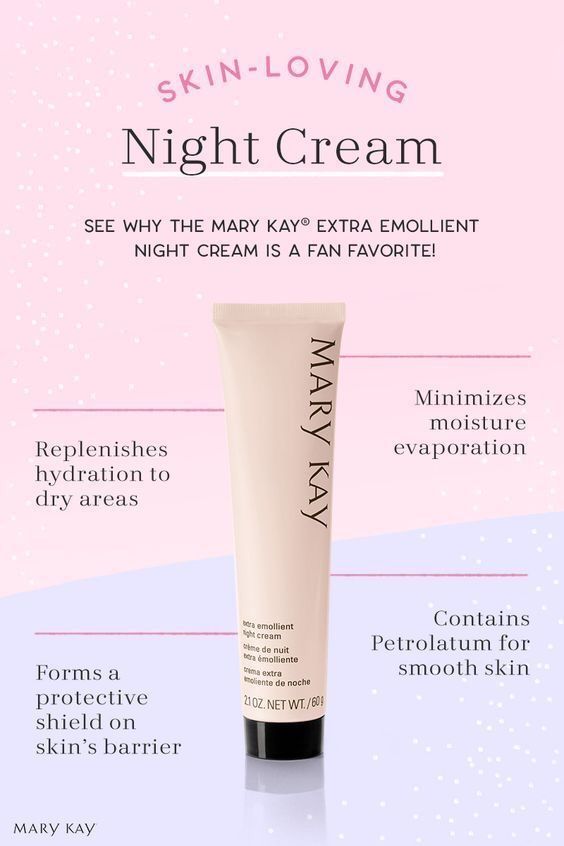Mary Kay Extra Emollient Night Cream Helps maintain the natural moisture of the skin and replenishes hydration in very dry areas. Excellent for dry patches, especially on hands, elbows and feet. Suitable for all skin types. Clinically tested for skin irritancy and allergy. Non-comedogenic (will not clog pores). Hypoallergenic.