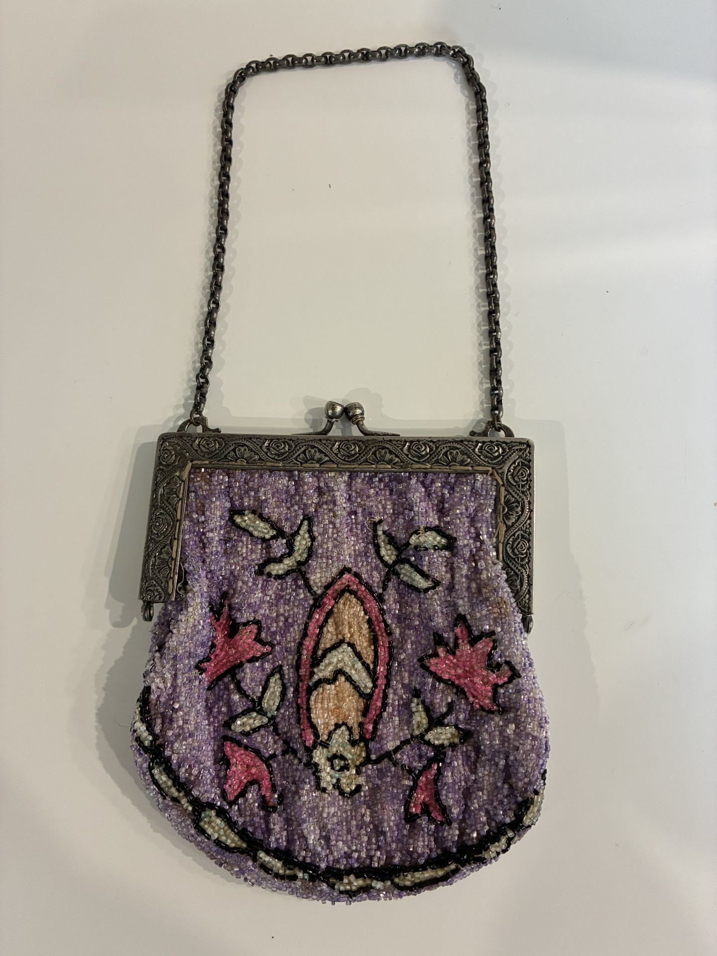 Beautiful vintage beaded evening purse featuring intricate purple glass beadwork with floral and bird-style detailing. Ornate silver-tone metal frame with engraved design, kiss-lock closure, and matching chain strap. A stunning statement piece for special occasions, collectors, or vintage lovers.