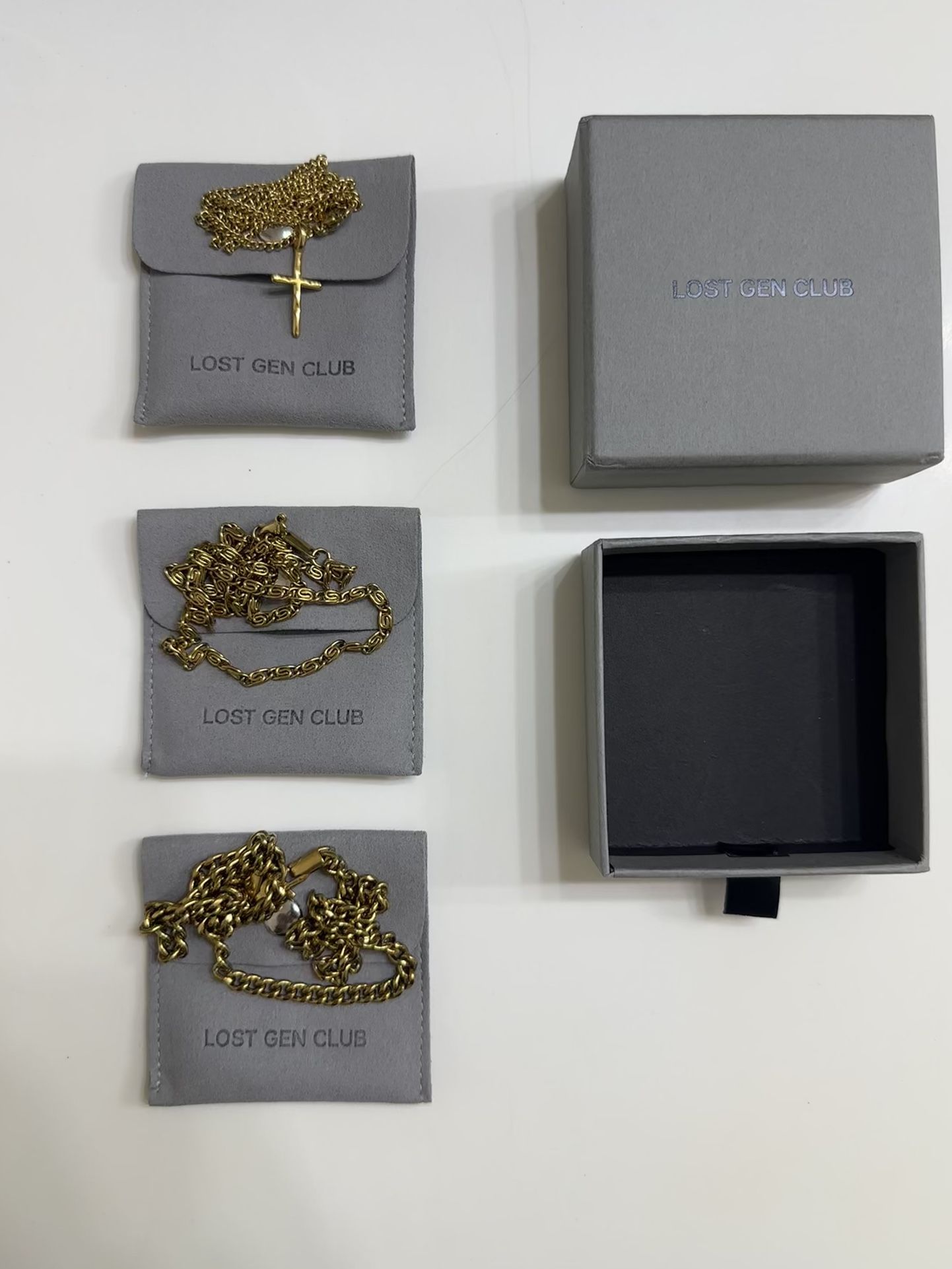 All Made of 18K gold plated stainless steel These are from the brand Lost Gen Club Cross chain - $70 (OBO) Nusa chain - $50 (OBO) Cuban chain - $70 (OBO)
