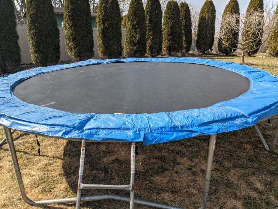 Jump King Trampoline. No tears in the mat or covers. Taken down and put away over the winter season. Asking $215 obo. Everything in picture comes with it including 2 extra springs