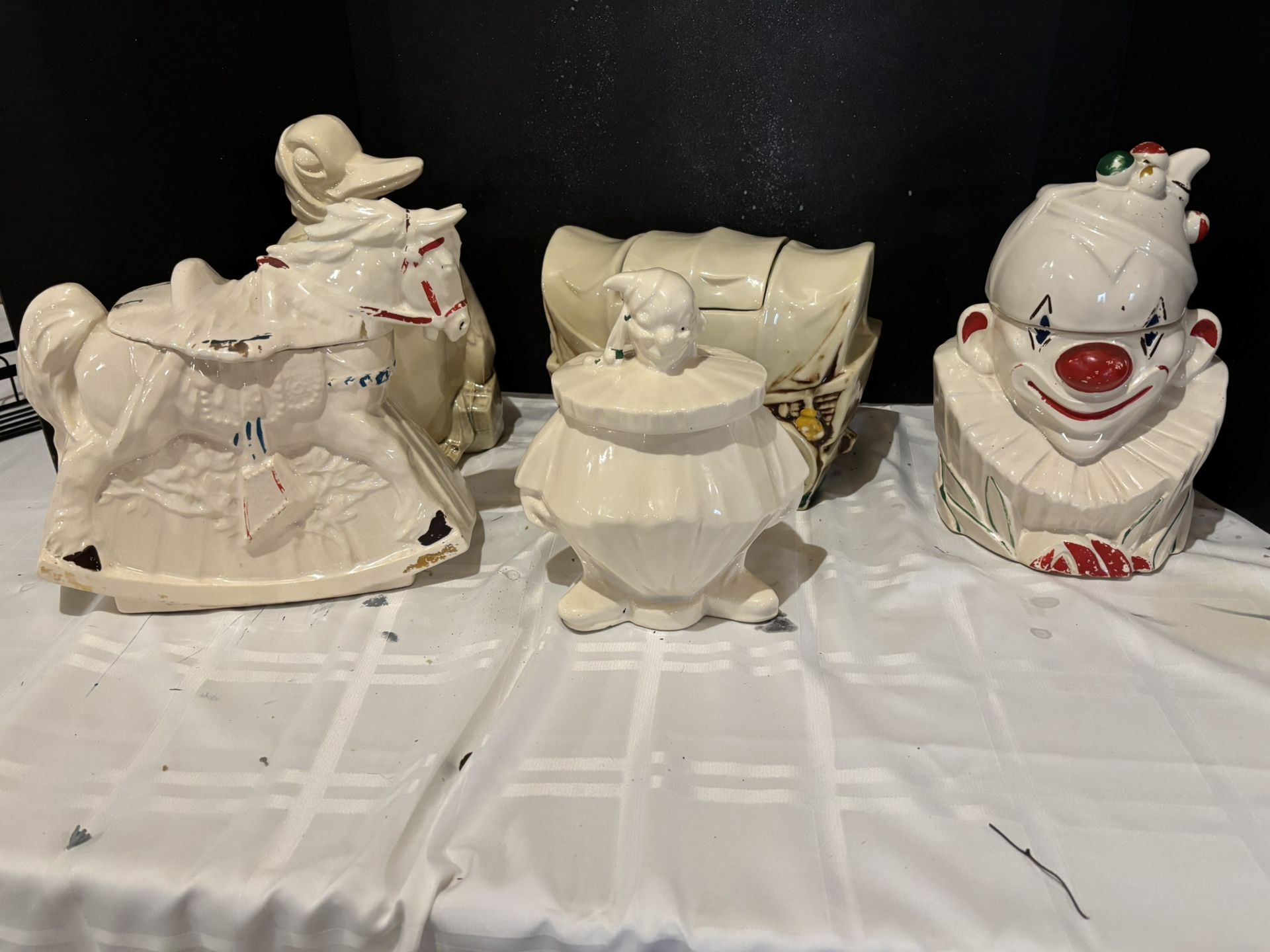 5 vintage McCoy jars. All in good condition. Clown head has most cold paint, small clown has no cold paint left. Rocking horse still has a little paint. Mother Goose is beautiful! I’ll sell as lot, or contact for individual prices. Located in South Fayette
