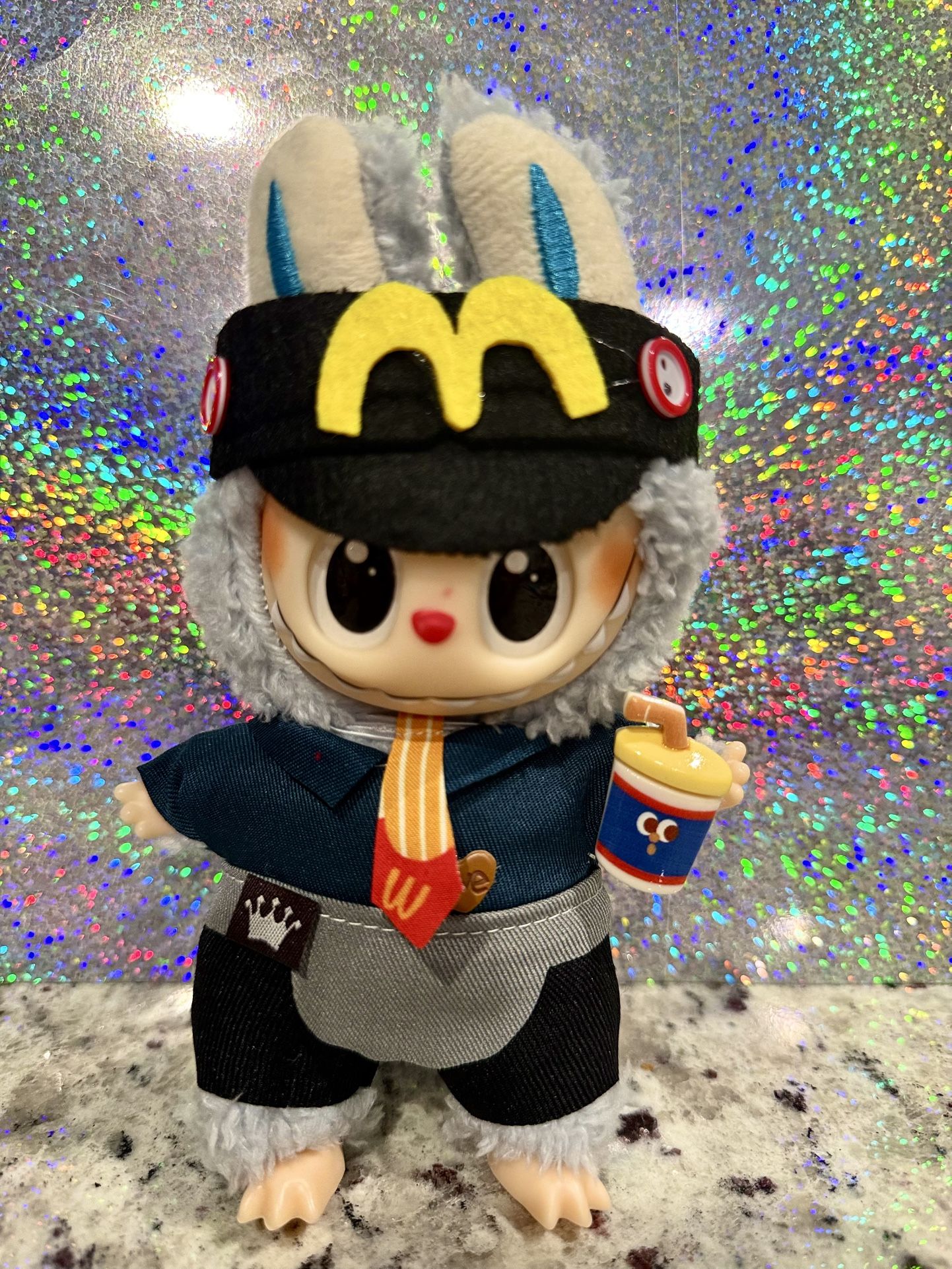 Custom Labubu “McBunny Manager” with Mini Car Seat – Drive-Thru Ready! This hardworking Labubu/Lafufu just finished the late shift at everyone’s favorite golden-arch fast-food place and is ready to clock in at your house. Dressed in a tiny uniform, necktie, and visor, drink in hand, he even comes with his own little car seat so you can safely “drive” him home or display him like the VIP employee of the month he is. Perfect for Labubu/Lafufu collectors, toy lovers, or anyone who wants a hilarious conversation piece on their shelf or dashboard. In excellent, new condition. Scoop up this custom cutie before someone else promotes him to their manager of snacks and late-night fries!