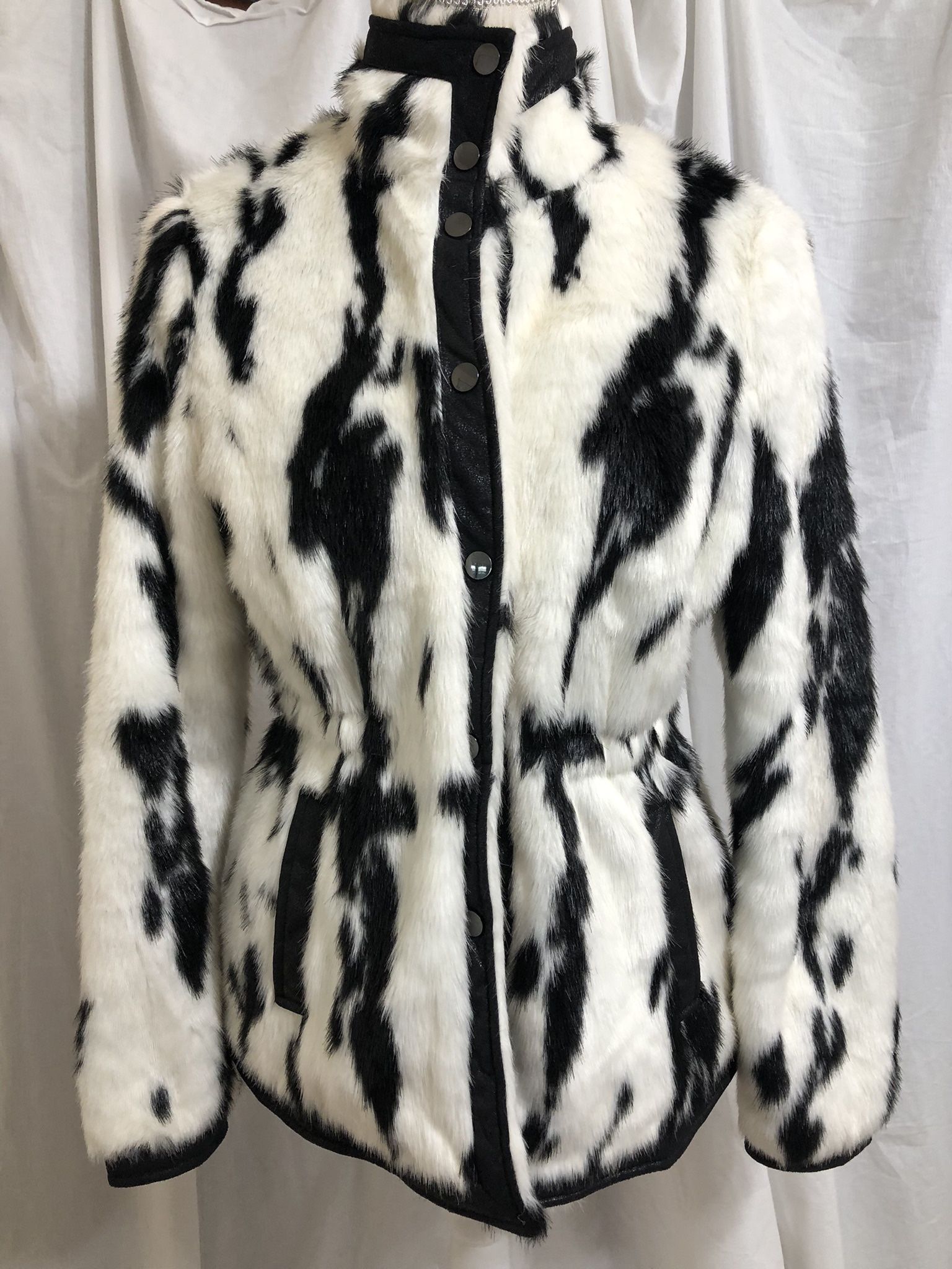 Cow print faux fur jacket with a belted waist, featuring a black and white design. You want it you need it!! #coat #fauxfur #jacket #cowbow #cowgirl