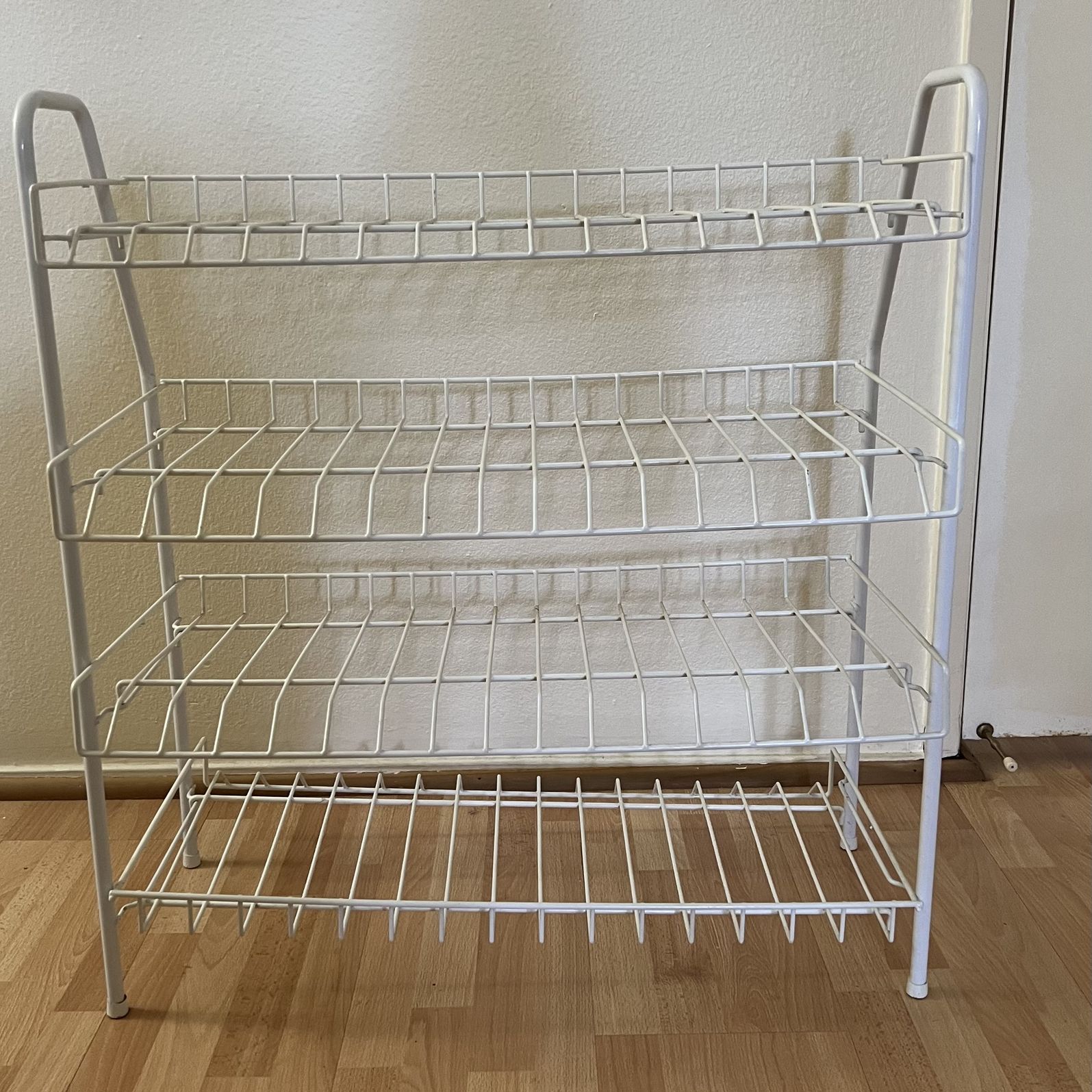 4-Tier White Metal Wire Storage Rack / Shoe Rack Sturdy white metal wire shelving unit with 4 tiers. Perfect for organizing shoes, pantry items, bathroom supplies, laundry room essentials, or closet storage. Lightweight but durable, and easy to move around. Great for small spaces, apartments, dorm rooms, or garages. Clean and in good condition.