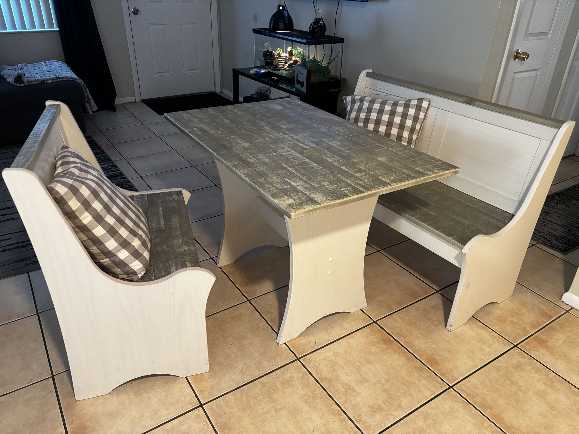 Hi, I’m selling our farmhouse wood kitchen table. I’m asking $60 for it. The pillows are not included. Sorry there is a small little crack on one of the chairs Top part can be fixed with a little bit of glue other than that it’s in beautiful condition, the seats lift up for storage.