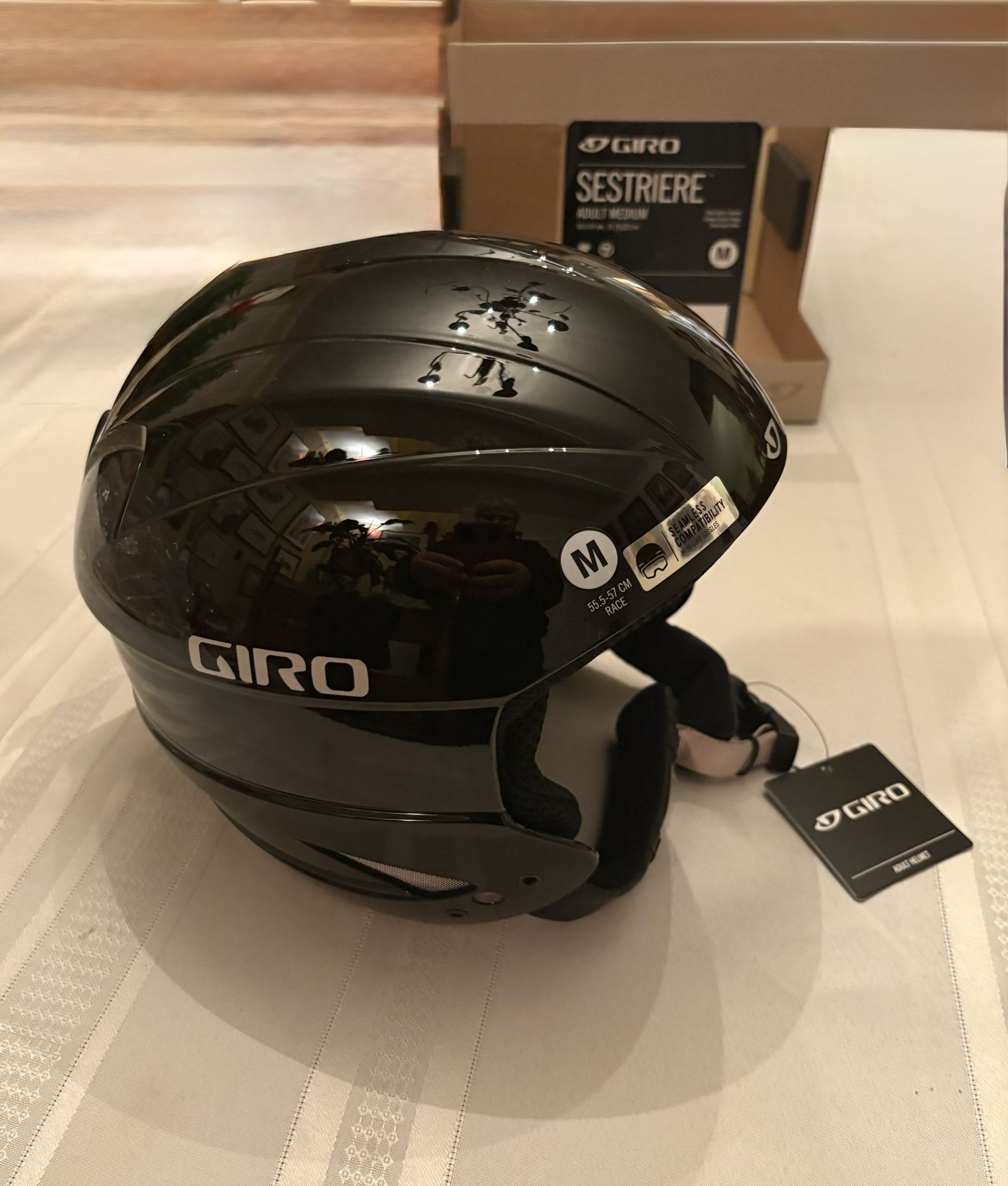 Brand new Giro Sestriere ski snowboard helmet. Black color, adult medium size (55.5-57 cm). Comes with tags still on, ready for the slopes. Seamless compatibility with Giro goggles.