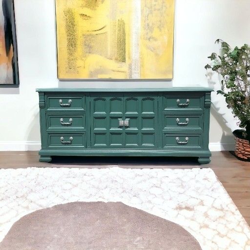Home / Dressers / Long Green Dresser Bedroom Furniture TV Stand Buffet Mid Century Credenza Sideboard Vintage Nursery Drexel          Previous Next Long Green Dresser Bedroom Furniture TV Stand Buffet Mid Century Credenza Sideboard Vintage Nursery Drexel $899.00 Customizable. Contact Us about choosing your own paint Color. Available for immediate purchase This is a beautiful vintage buffet/ dresser credenza has 9 drawers . The drawers glide as intended. It is ready for customization in the paint color of your choice. Approximately 77*20*32 Our process includes cleaning and sanding before priming. Next we coat with a very durable industrial grade Acrylic Urethane Enamel in the color of your choice. We do not use ordinary latex paint. This industrial coating is used in commercial settings and facility management . Designed for use high traffic areas such as stairs , railings and warehouse floors it performs outstandingly in a home / office environment.