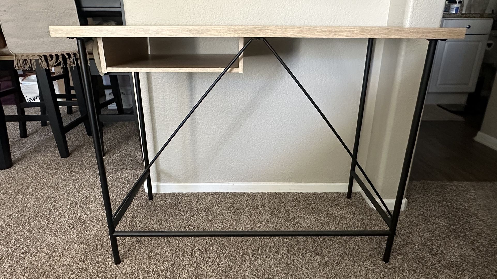 • Wood and metal writing desk • Metal frame • Open storage shelf • Great for storing office supplies and more • Pairs easily with existing decor Dimensions (Overall): 30 Inches (H) x 40 Inches (W) x 20 Inches (D) Weight: 32 Pounds Great condition/ lightly used Price Negotiable