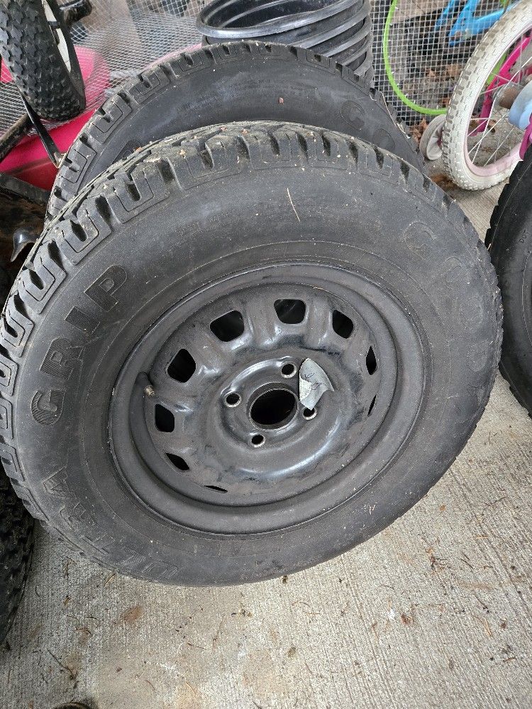 2 GOODYEAR Ultra Grip (185/70R13) M+S studded snow tires on rims. have lots of life left on them.. very lightly used & stored indoors no damage or flaws at all... very well cared for