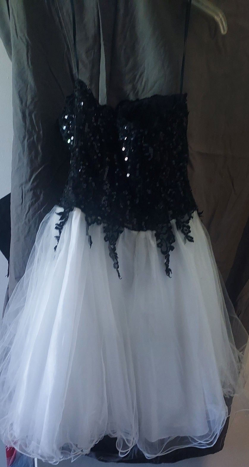 Gorgeous black and white strapless, mid thigh dress. Top has black sequins , bottom has white netting