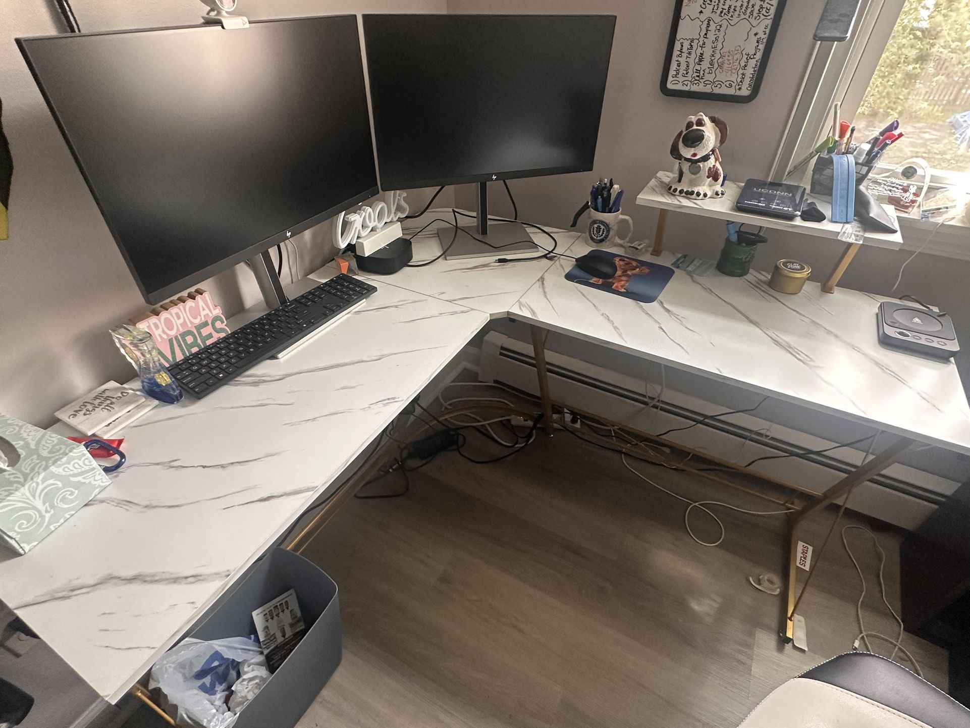 Selling a stylish L-shaped desk in perfect condition—no dings or scratches. Features a sleek marble-look finish that fits modern and minimalist spaces. Great for home offices, studying, or gaming setups. 🖥️ Spacious and sturdy, ready to use. 📅 Must go by 5/31.