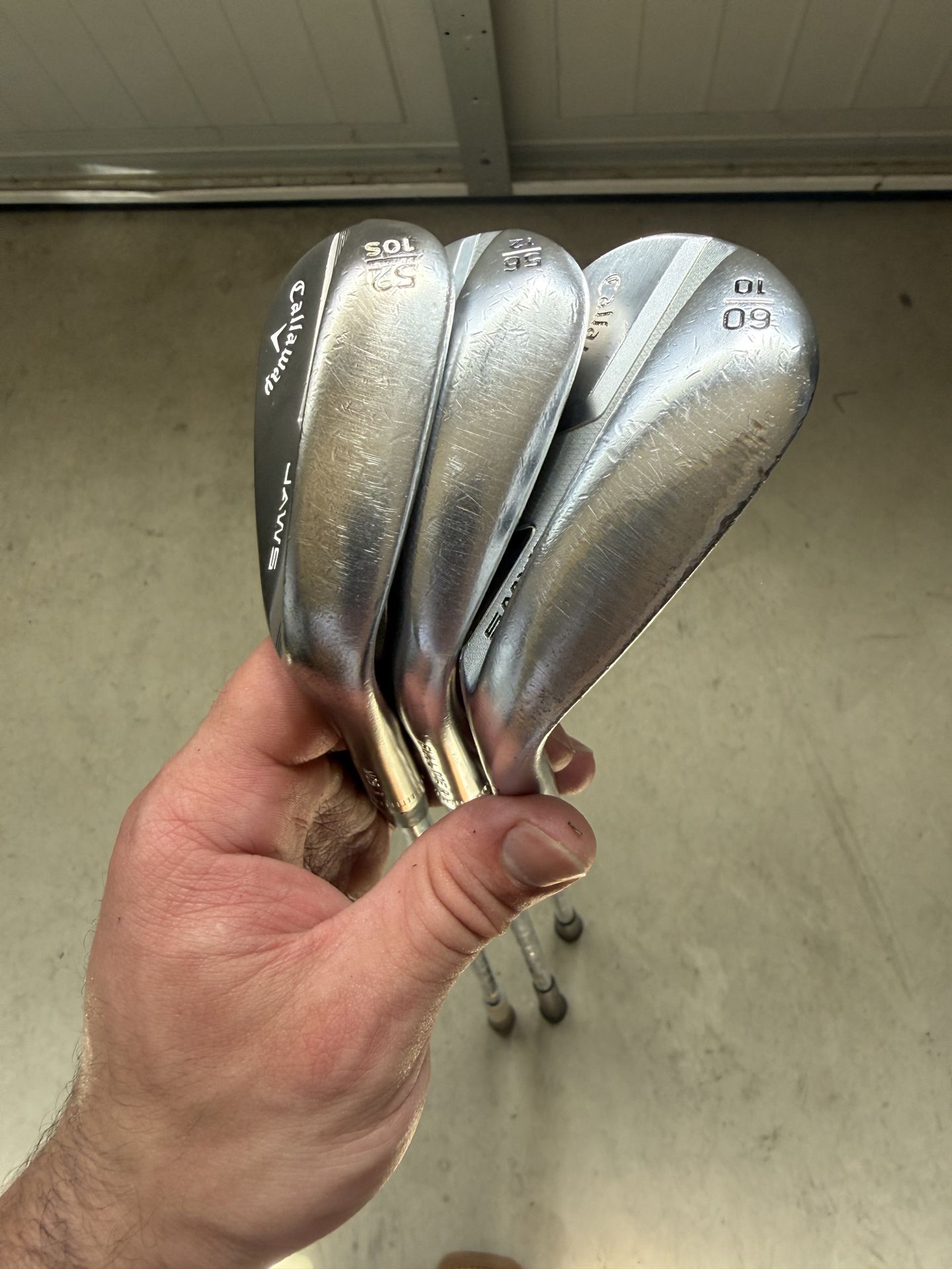 I have some wedges I’m trying to sale ALL together. They are in good playing condition. They have normal wear, grooves are in good condition. I have a Jaws MD5 52 degree wedge Brand new S200 shaft and midsize standard MCC4 grip. 56 degree Jaws full toe wedge 60 degree Jaws full toe wedge.