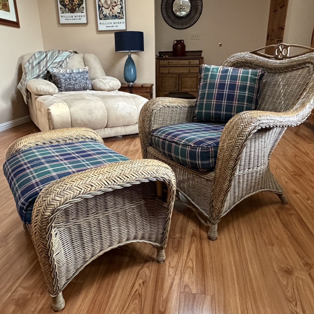 Vintage, quality made, sturdy, and in perfect shape. 30 - 40 years old. High end, made in the Philippines with a craftman’s attention to style and detail. This has always been an indoor chair, but could be used outdoors if not exposed to harsh hours of sunlight. All wicker and upholstery is in perfect shape with no scratches, tears, stains, or broken or loose wicker. Note: The photos do not display the exact colors of the cushions. There are forest green and navy blue checks, with beige and burgundy colored stripes. Slightly more muted than photos, but not faded or worn. Dimensions: The chair is 34” deep x 31.5” wide x 34.5” high. The sitting area is 17.5” high x 23.5“ deep. x 22.5 ” wide. The ottoman is 21” deep x 31” wide x 20” high. The chair and ottoman look best when occupying a footprint of approximately 58” in length.