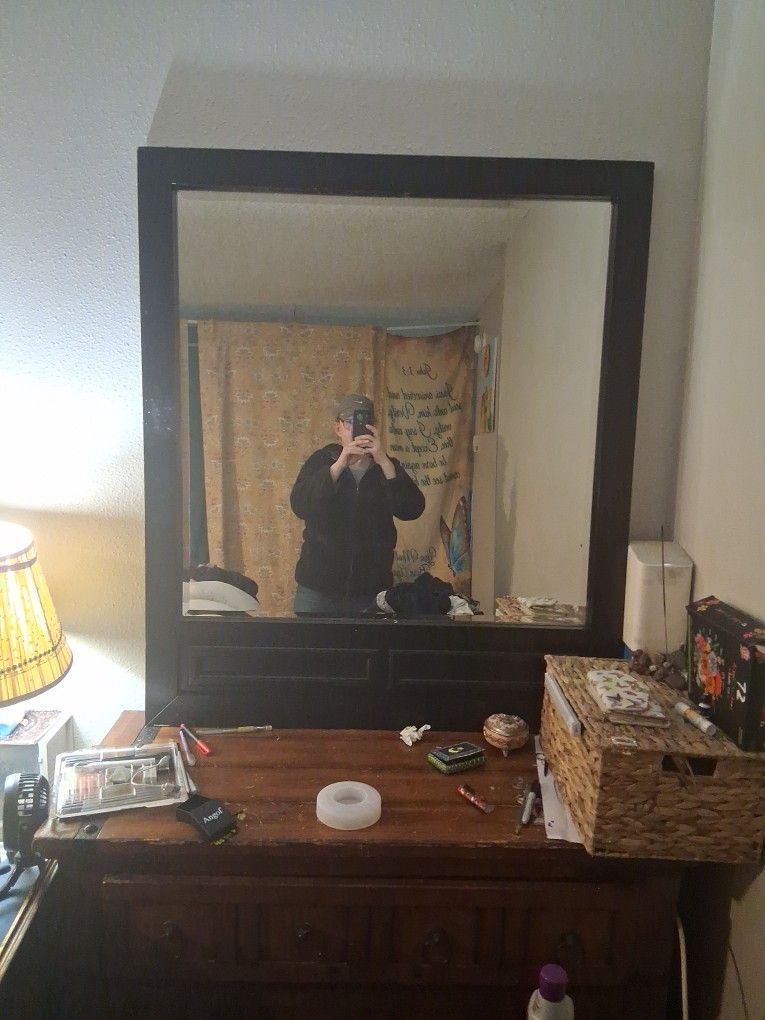 Actual mirror size is 33" ×33" and with frame is 44×38 very nice heavy duty mirror that belongs ontop of a dresser, black in color.