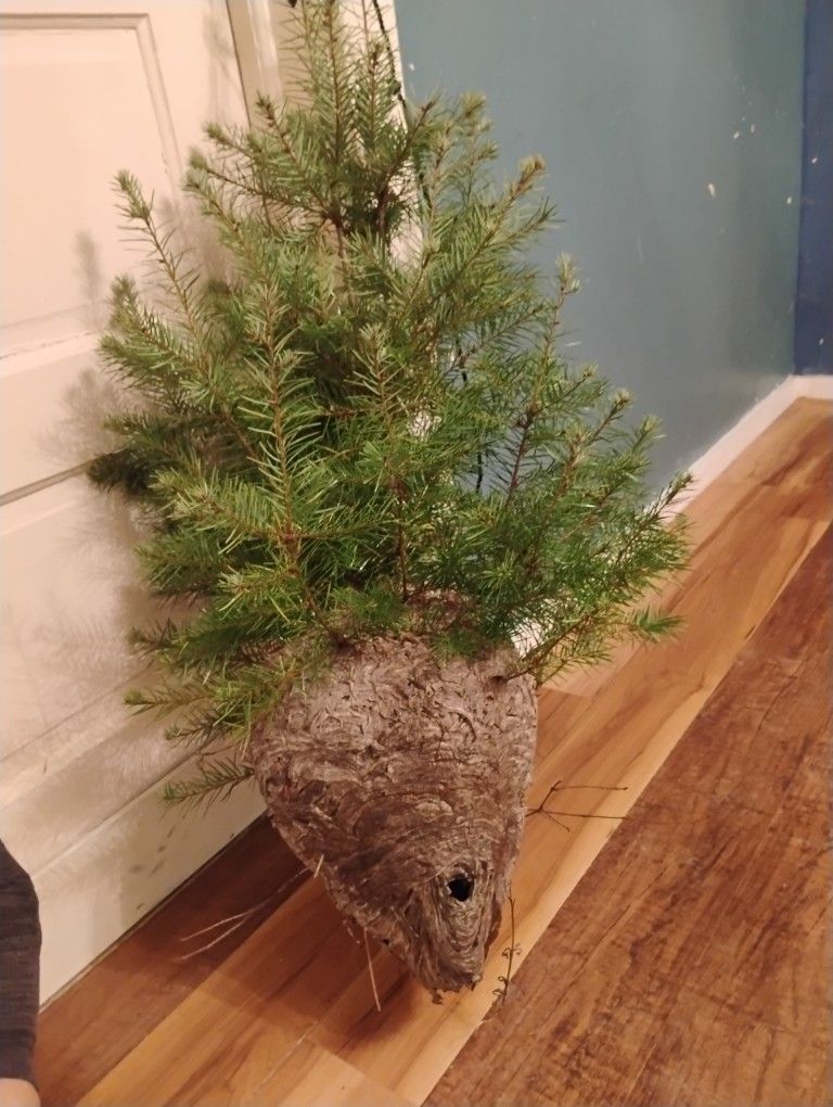 Bald face hornets nest built into a little fir sapling tree. Preserved to last