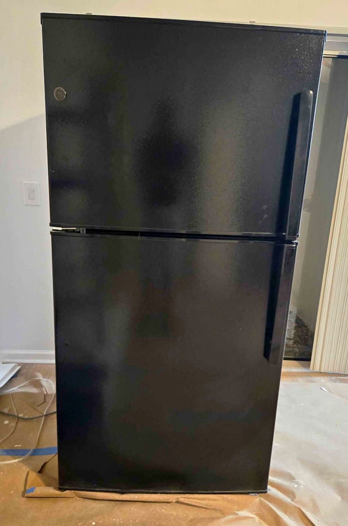 Black GE 21.1 Cubic Feet Top Freezer Refrigerator in new condition...never used. Measures 32.8"W x 34"D x 66.7"H. It is a little dust and a couple of minor scratches on the sides from being in the kitchen during remodeling. Regular price in store is $1,549 plus tax. On sale in stores now for $1,394 plus tax. Buy it here for only $750.