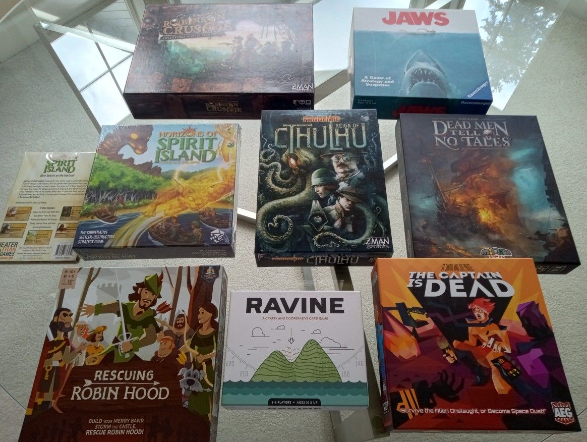 Selling each of these games for $25 each: Robinson Crusoe Adventures on the Cursed Island Jaws (new) Horizons of Spirit Island +expansion (new) Reign of Cthulhu based on Pandemic Dead Men Tell No Tales (sleeved) Rescuing Robin Hood (sleeved) Ravine The Captain is Dead Feel free to ask questions. Pickup either by Downtown Seattle during weekday or on the border of Kirkland/Woodinville/Bothell (Kingsgate neighborhood not too far from Zulu's). Cash or PayPal (f&f). Raising funds to pay for shipping cost for the JVMF Charity Auction.