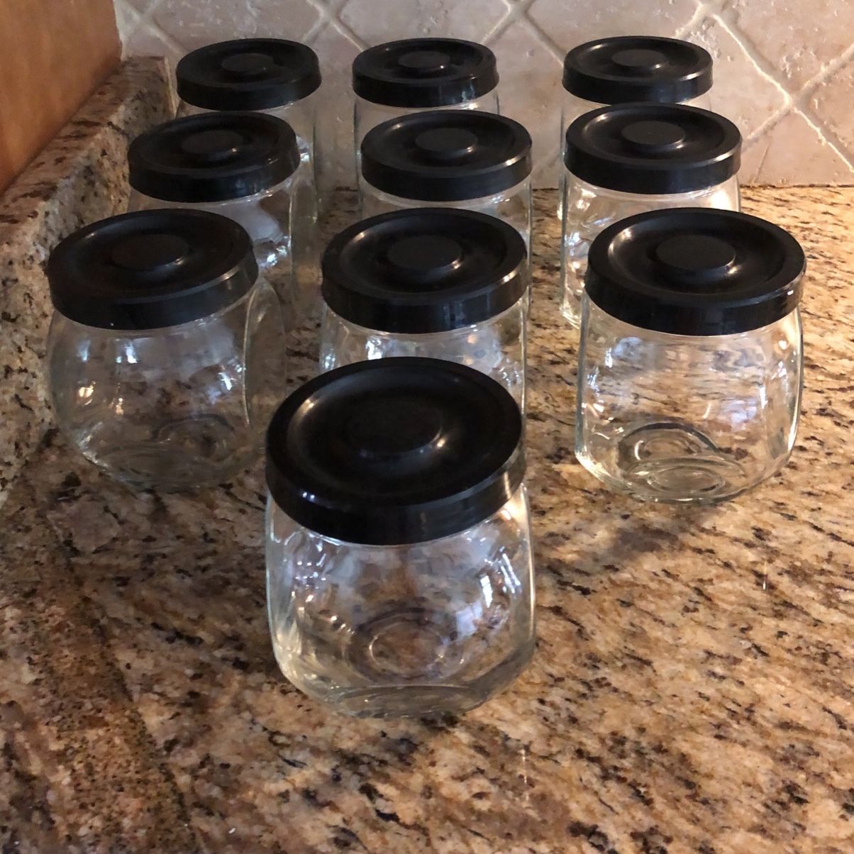 Used Very Good Condition 10 Jars Clear Glass & Black Plastic Covers I used it for Spicy , Like Cloves, Sticks Cinnamon, Powder Cinnamon, Coriander Powder and Seeds .... Payment cash only Don’t hold Don’t deliver