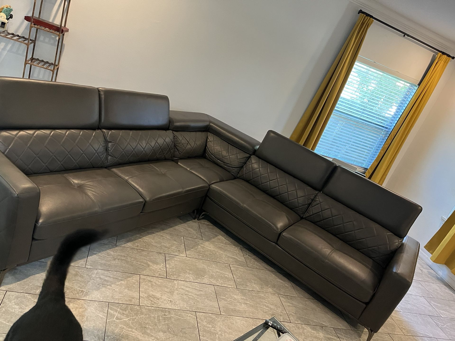 3 pieces 114x114 L shape 40 inches deep Minor wear. 2 years old Dark gray leather Headrest go up and down
