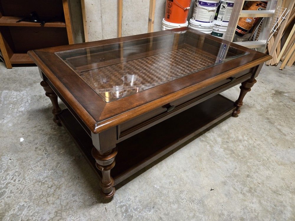 Solid wood coffee table with removable glass top and sliding display drawer. Nice table with some normal wear, and a few blemishes including a faint cup ring on the top, as shown in the photos. Local pick-up only in Lawrence, KS.