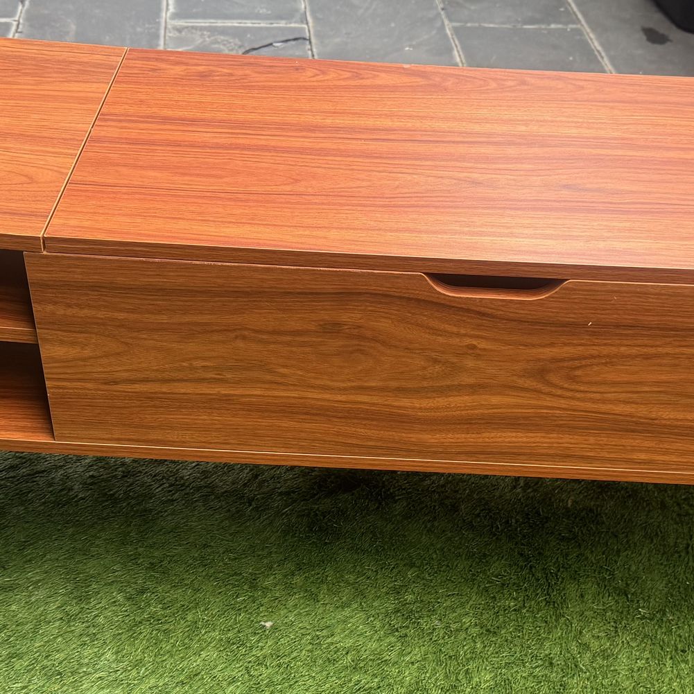 Description: Beautiful mid-century modern coffee table with a warm teak-style finish and clean lines. This piece is both stylish and functional featuring: • Lift-top with hidden storage compartment • Interior dividers for organization • Open shelving on one side • Sturdy construction with tapered legs Great for living rooms, apartments, or anyone going for that MCM look. Condition is very good with light signs of normal use. No major damage. Rough dimensions 4’ wide , 16” deep , 18” H closed and 24” H open These dimensions are rough rounding. If you need exact, let me know and I will be happy to get them for you!