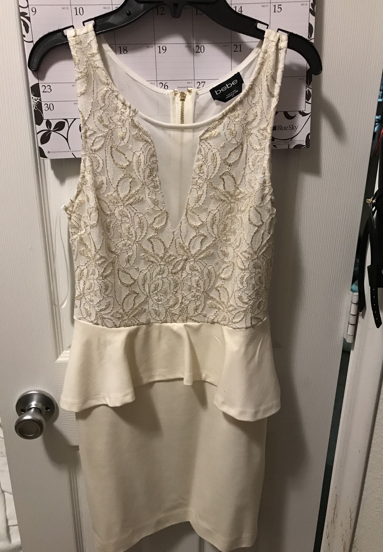 Bebe, S/P gold and beige dress. Fits above the knee. Stretchy and very comfortable.
