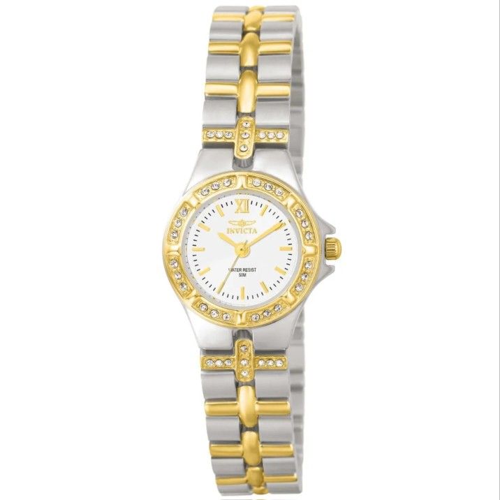 Stainless steel case with a two-tone (silver-tone and gold-tone) stainless steel bracelet. Fixed gold-tone bezel set with crystals bezel. White dial with gold-toned hands and index hour markers. Roman numeral marks the 12 o'clock position. minute markers around the outer rim. Dial Type: Analog. Ronda caliber 763 quartz movement. Scratch resistant flame fusion crystal. Pull / push crown. Solid case back. Round case shape. Case size: 21.5 mm. Case thickness: 8 mm. Band width: 12 mm. Band length: 7 inches. Deployment clasp. Water resistant at 50 meters / 165 feet. Functions: hour, minute, second. Additional Info: in general, suitable for short periods of recreational swimming, but not diving or snorkeling. Dress watch style. Watch label: Swiss Movt. Invicta Wildflower White Dial Two-tone Ladies Watch 0133.