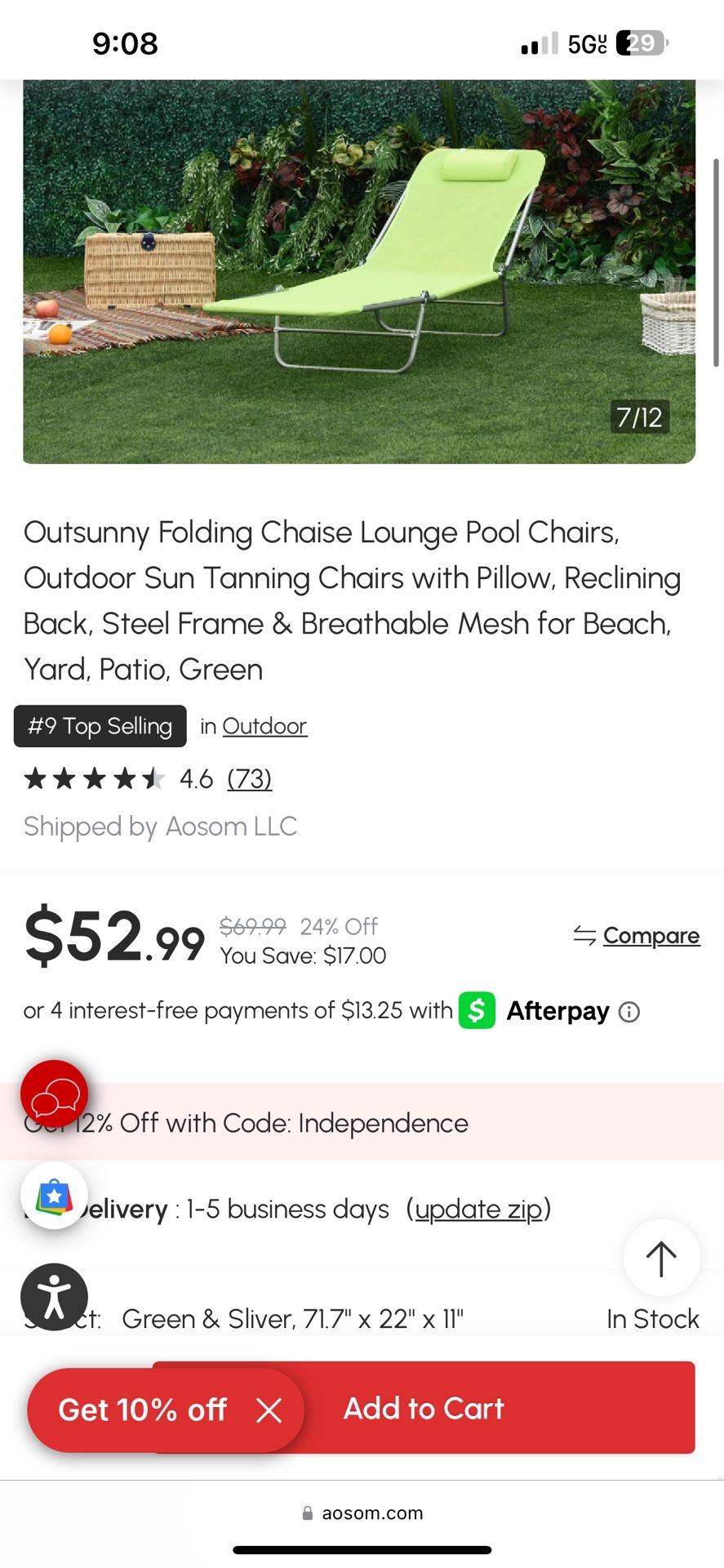 Outsunny Folding Chaise Lounge Pool Chair - Green Relax in ultimate comfort with this portable Outsunny folding chaise lounge. Perfect for the beach, pool, yard, or patio, it features a reclining back, sturdy steel frame, and breathable mesh fabric for cool comfort. Includes a comfortable pillow for added relaxation. Retail Price: $52.99 ASKING 40 OBO