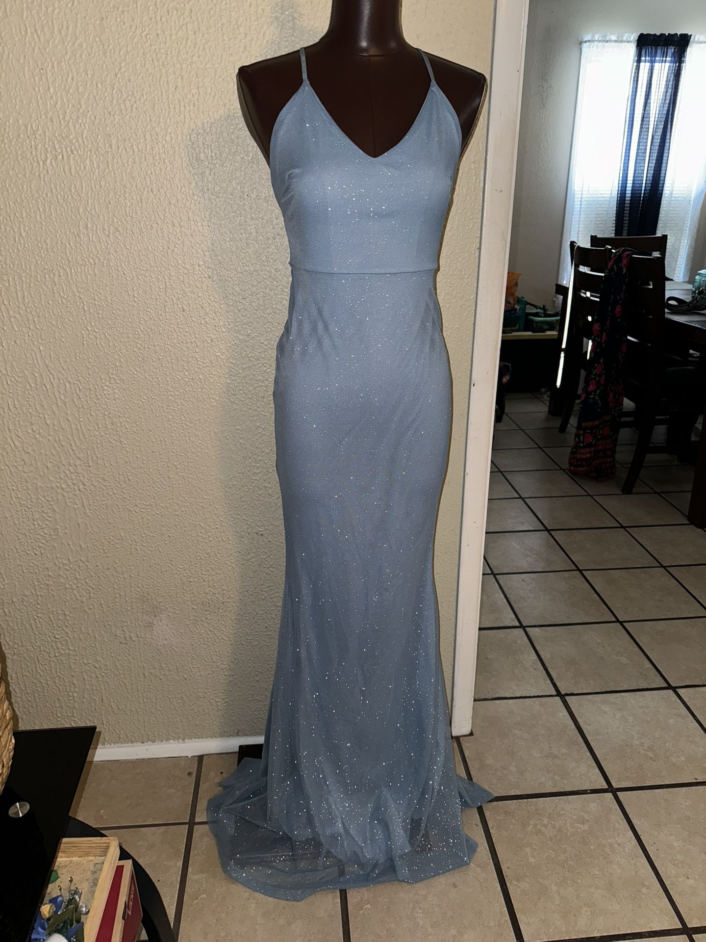 Mermaid Straps Long Blue Sparkly Prom Dress V-Neck Evening Dress size small