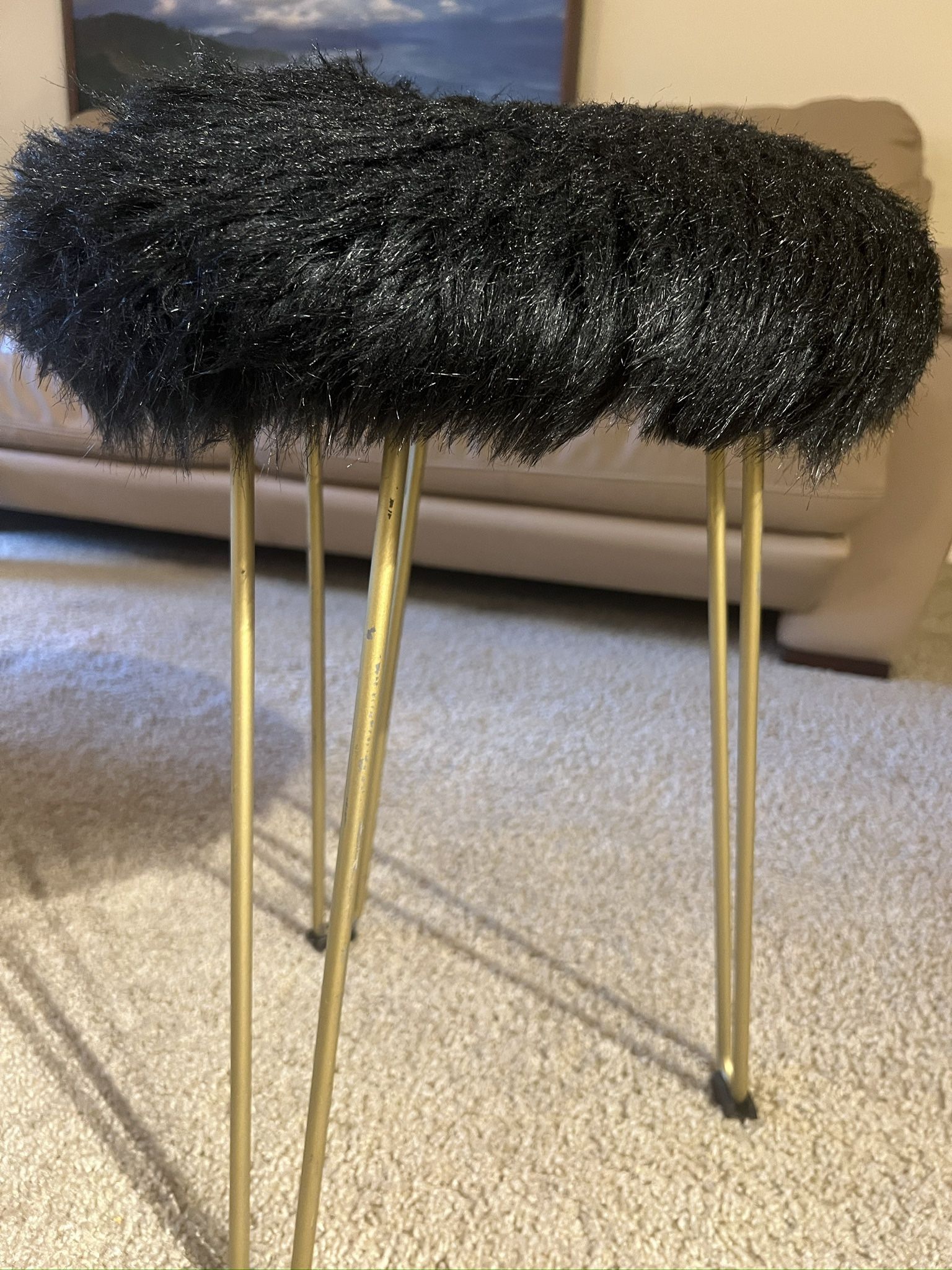Chic black faux fur round stool with gold metal legs. Perfect as an accent seat, vanity stool, or decorative piece for any room. Soft and comfortable with a modern glam look. Lightweight and easy to move. Legs show some paint wear and scratches (see photos), but the stool is sturdy and in good overall condition.
