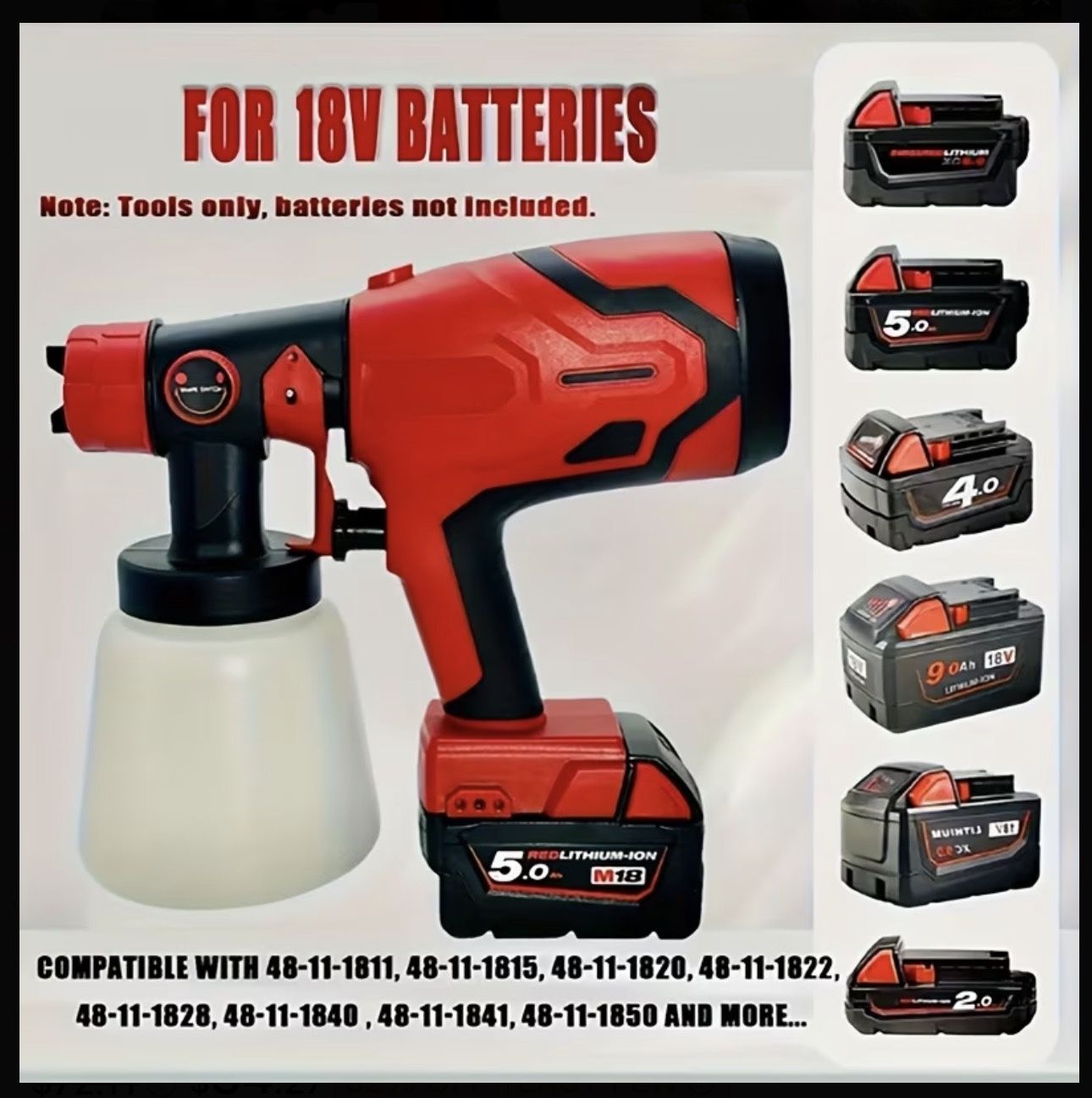 60$ each Suitable For 18V Battery Airless Electric HVLP Spray Gun Tools, For House Paint, Home Inside And Outside, Wood, Walls, Furniture, Fences, Doors compatible for Milwaukee battery (Battery not included) El spray se puede usarcon bateria de Milwaukee Adecuado para herramientas de pistola pulverizadora eléctrica sin aire HVLP de 18 V, para pintar casas, interiores y exteriores, madera, paredes, muebles, vallas y puertas. Compatible con baterías Milwaukee (batería no incluida).