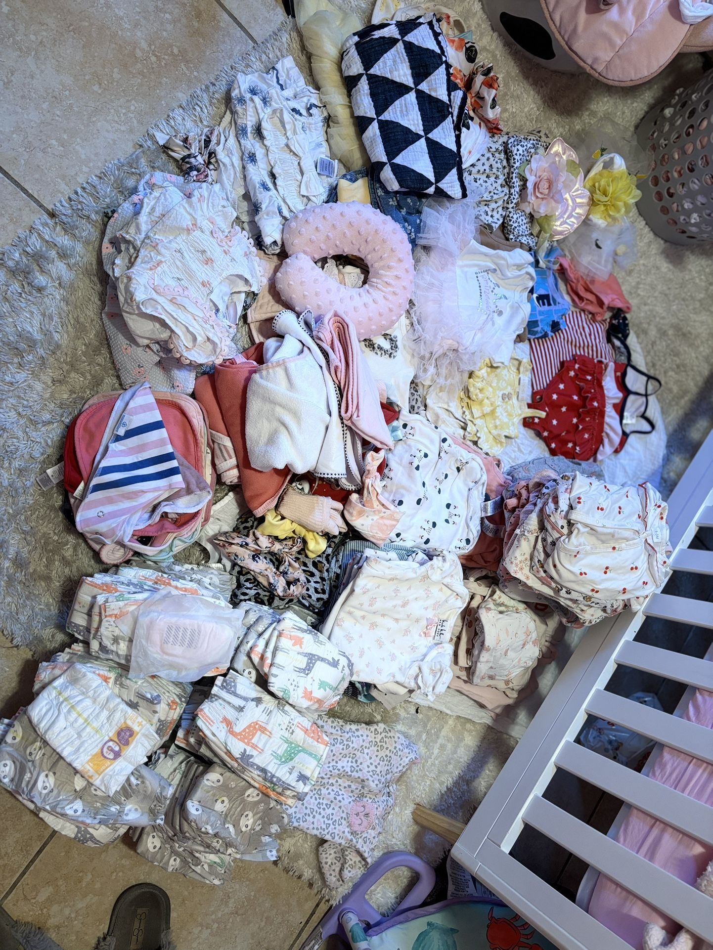 Mittens, hats, outfits ,bath towels , onies, diapers all for 60 must take all!