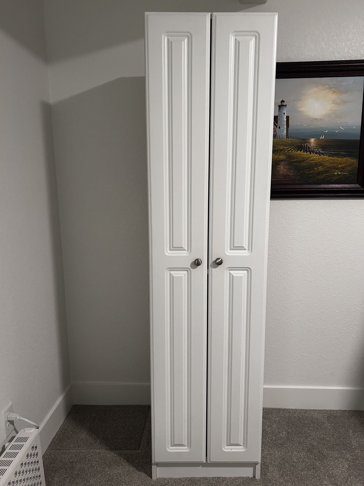 Tall white cabinet with two doors, four shelves, and metal handles. In pretty good shape; a few minor blemishes. Measures 71 inches tall, 18 inches, 15.5 inches deep.