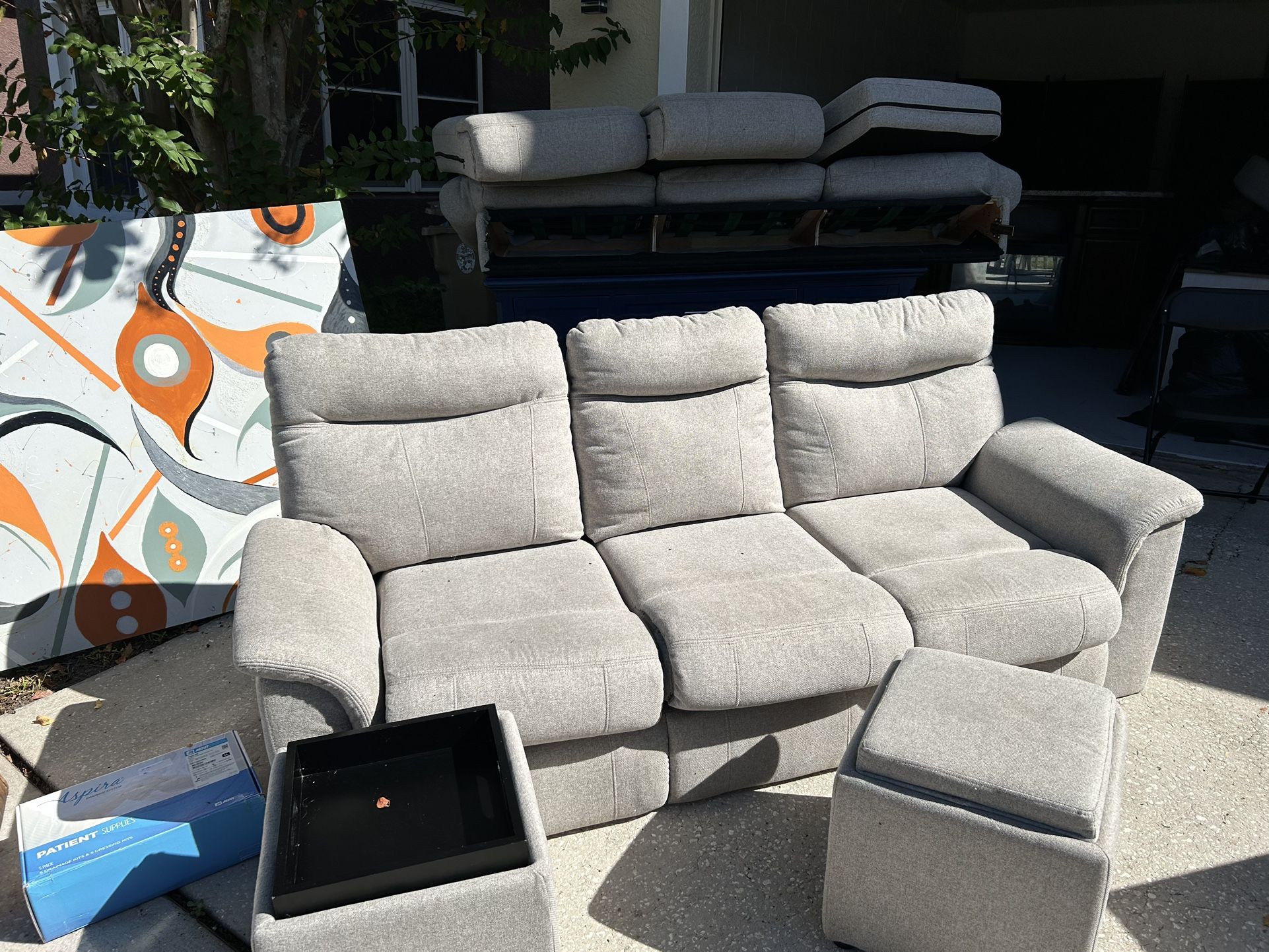 Two gray couches both has pull out beds including two ottoman’s less than two years old