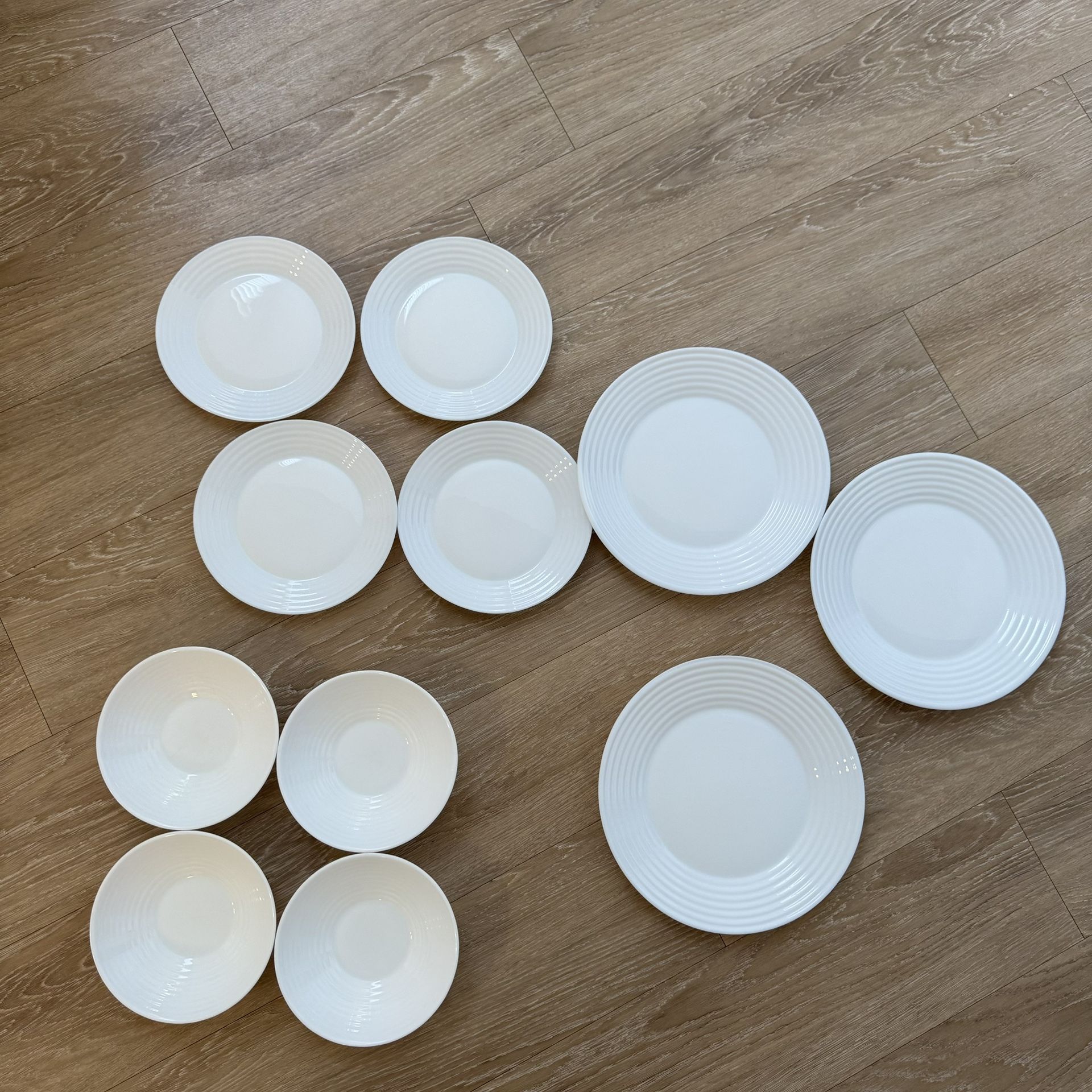 I am selling a 11-piece dinnerware set from Luminarc in the "Eminence" pattern. These are made of durable, break-resistant tempered glass and feature a classic concentric ribbed design on the rim. They are both dishwasher and microwave safe. Set Includes & Dimensions: • 3 Dinner Plates: approx. 25cm (10") diameter • 4 Salad/Dessert Plates: approx. 19cm (7.5") diameter • 4 All-Purpose Bowls: approx. 16cm (6.3") diameter Condition: This is a pre-owned set. There are some minor surface scratches and signs of use from normal stacking and dining, but there are no major chips or cracks. The original box is included (the box shows some wear). Location: UTC area Pickup only. Payment : Cash only.