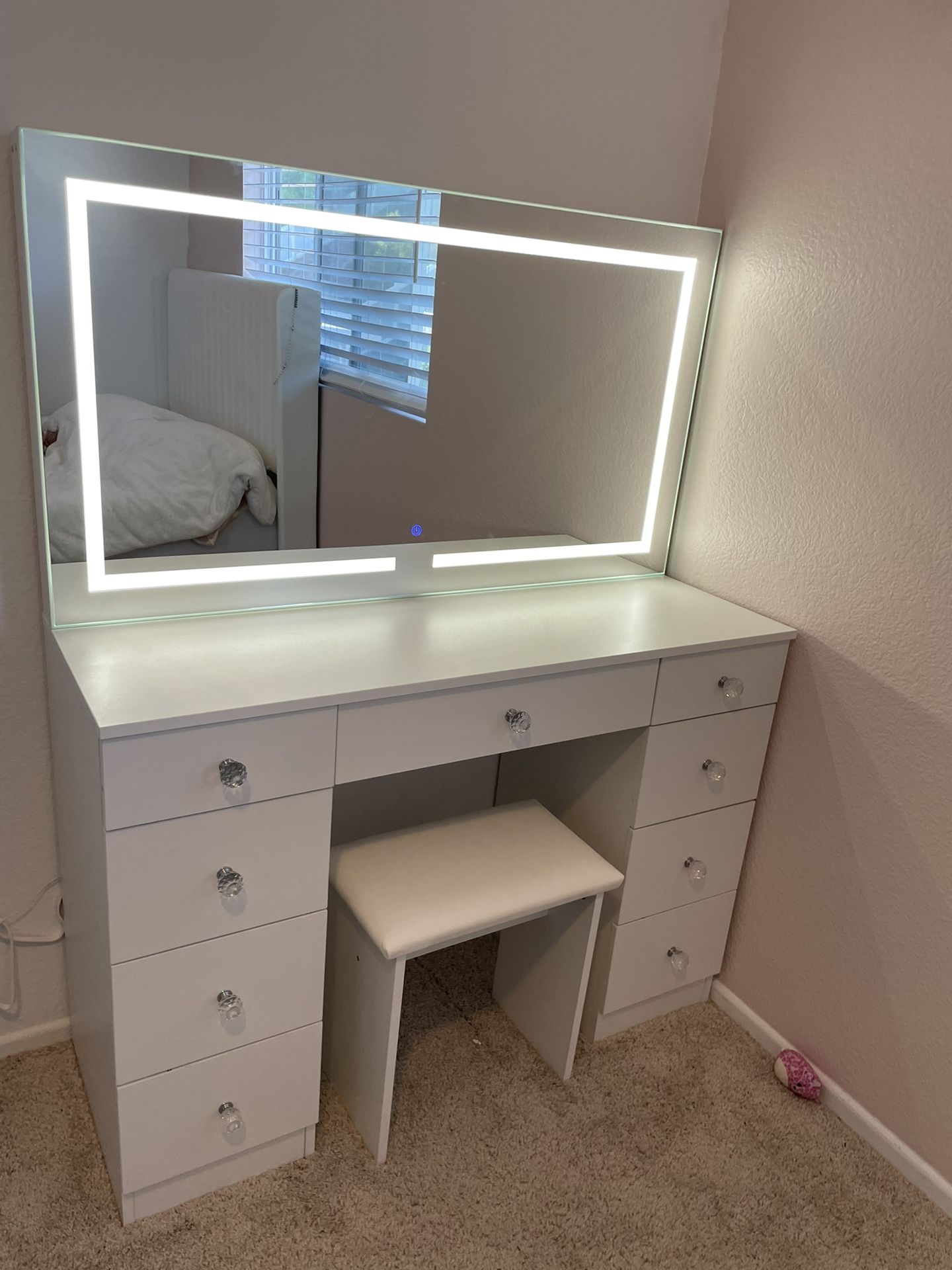 Brand new already built for your convenience. Mirror has 3 color change options. Built in plugs and USB plugs . Come with stool. Please see measurements in 2nd photo. Perfect kid or pre teen. 54 inch tall with mirror 43 inch wide