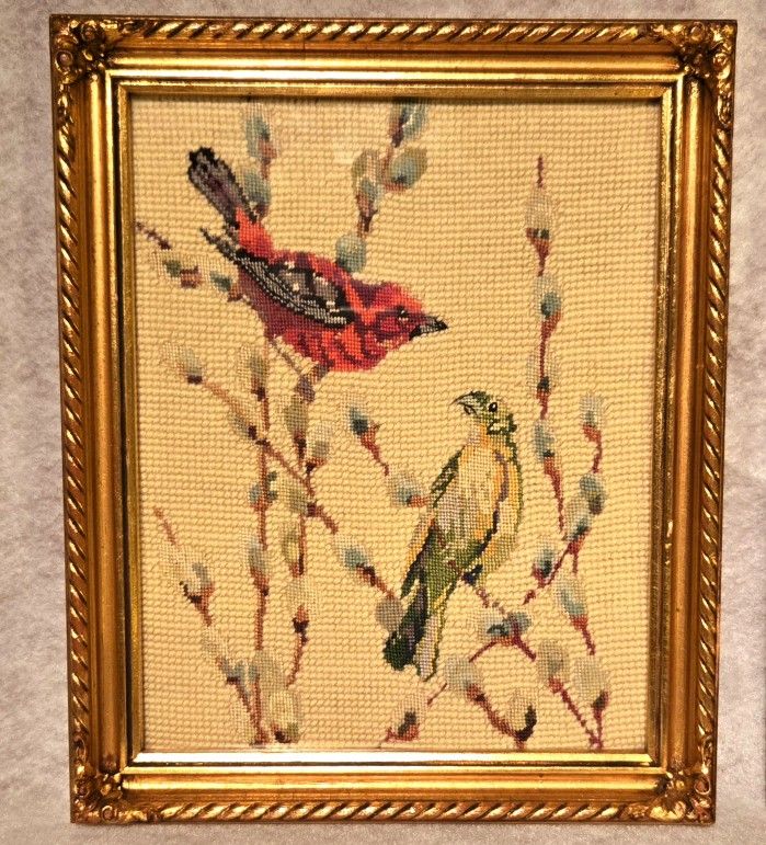 Antique Wool Embroidered Scarlet Tanager Pair, Needlework in Vintage Gold Frame Buyers choice if you want me to re-cover the back of the frame or leave as is for inspection. Inquire before purchase please. Must pickup
