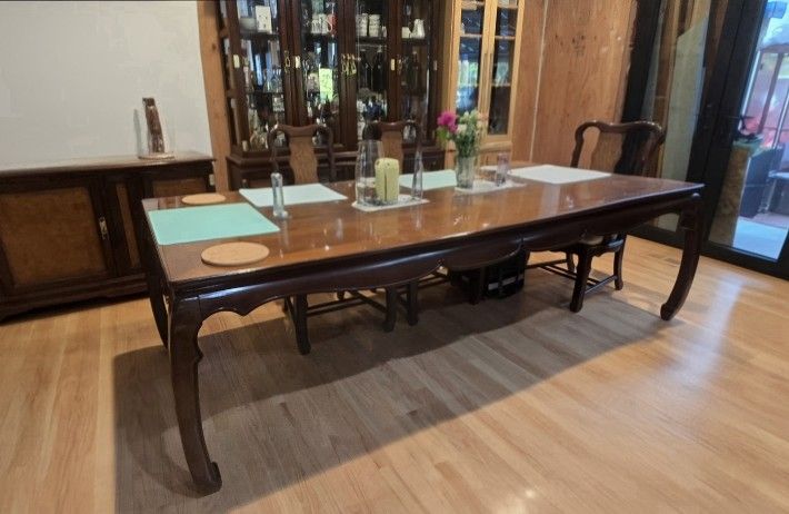 Oriental inspired dining room set that can fit a large family for dinner or small for everyday meals. It includes 68"-98" dining table (2 extension leaves), 2 captain chairs and 6 regular chairs, server hutch with drawers and storage, and large China cabinet. Real wood, great condition, lightly used.