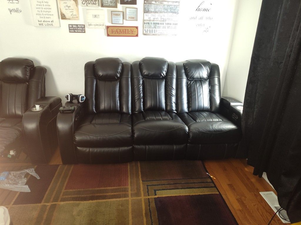 Black leather couch that reclines the headrest reclines there's open compartments on all arms of the couch storage compartments the middle has lights and like a tray for your cups good condition just got a new one