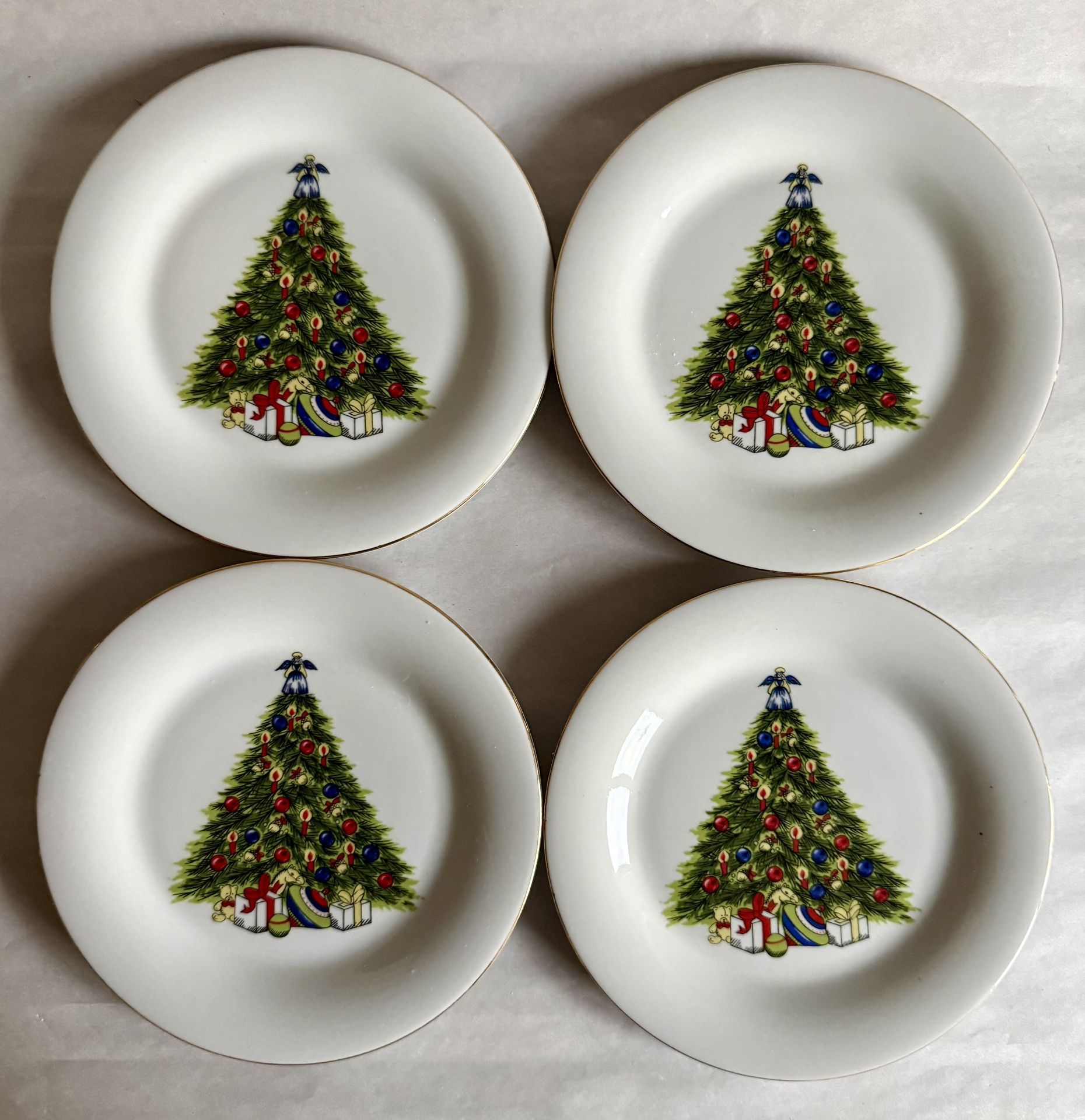 Set of four vintage Christmas-themed side/salad plates decorated with ornamented trees with presents underneath. All plates. are in excellent condition and show little to no sign or previous use. Plates measure 7.5 inches in diameter.