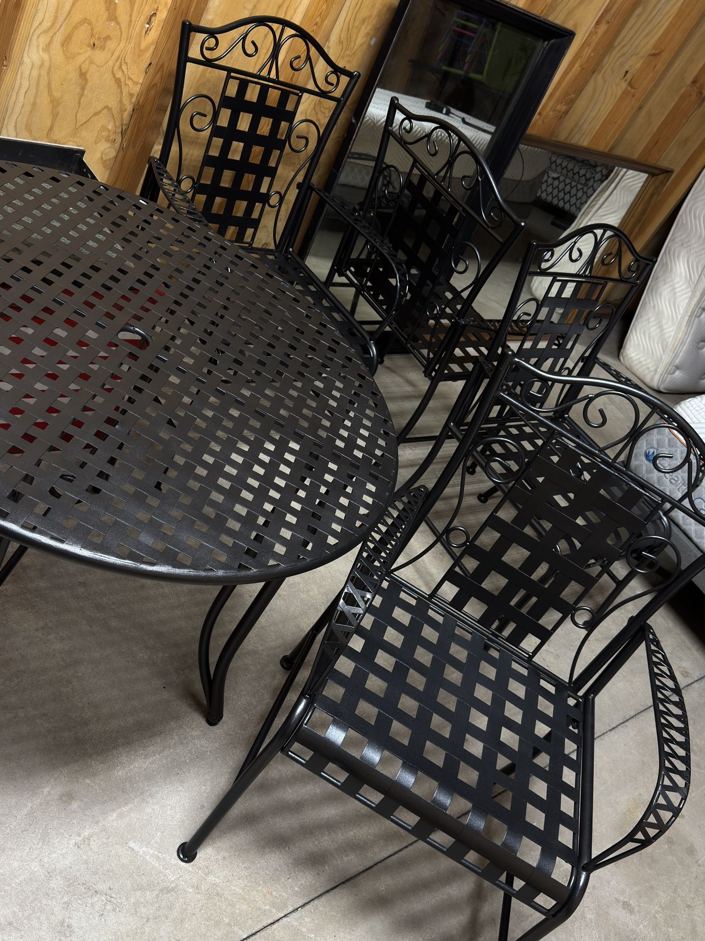 In excellent condition, all welds in tact, no punctured areas, very solid and durable. Metal all around! Color is hammered black. Delivery available anywhere for a reasonable fee, can also offer move in service to desired area if needed, more than happy to. Located: Stapley and the 60 in Mesa Table: 39” diameter 30” height Chairs: 18” floor to seat / 39” height to top of backrest.