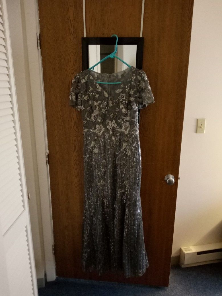 Worn 4 hrs in December by my mom for my son's wedding. Beautiful expensive gown with minor alterations size 8. Beautiful beading .